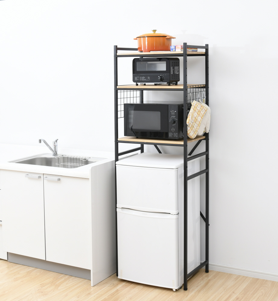 小型冷蔵庫やゴミ箱上のスペースを有効活用できる収納ラック。