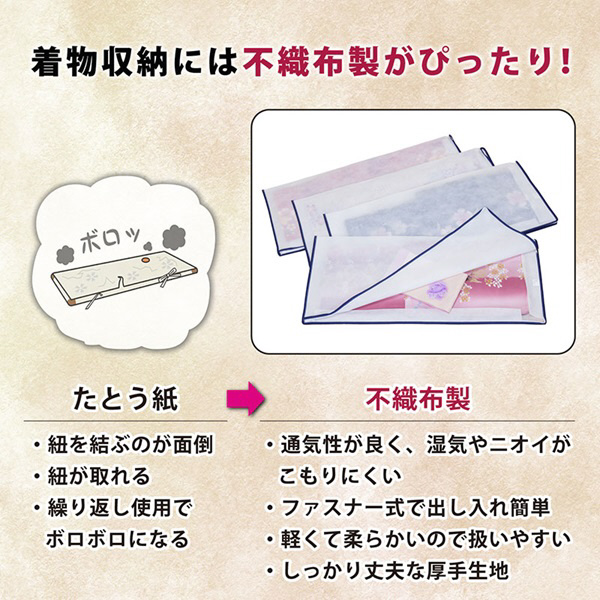 厚みのあるしっかりとした不織布を使用。たとう紙より丈夫で破れにくく軽くて柔らかいので扱いやすい。
