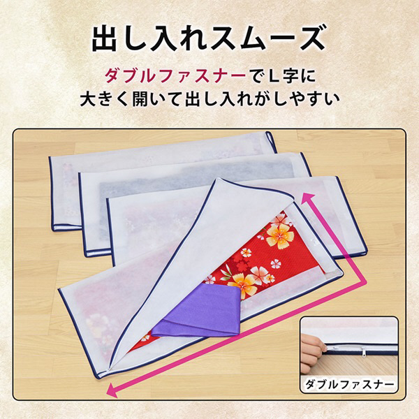 ダブルジップファスナーでL字に開く。ファスナー開閉時に着物を巻き込んで傷つけてしまうのを防ぐ布付き。