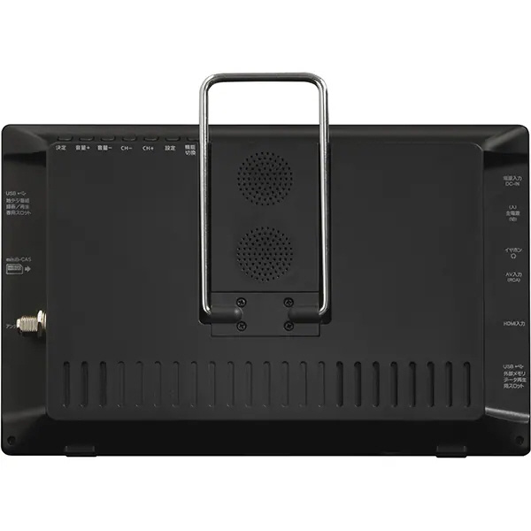 | 仕様1 | ●電源 ・ACアダプター:入力AC100-240V 50/60Hz 出力DC12V 1A ・カーアダプター:入力DC12V 出力12V 1.2A ・バッテリー:2000mAh 7.4V 満充電時間約3.5〜4時間 連続使用時間約2時間、●スピーカー:2W×2(ステレオ)、●入力端子:アンテナ、DC電源、USB×2(番組録画、メディア再生)、AV、HDMI、イヤホン、minB-CASカードスロット |