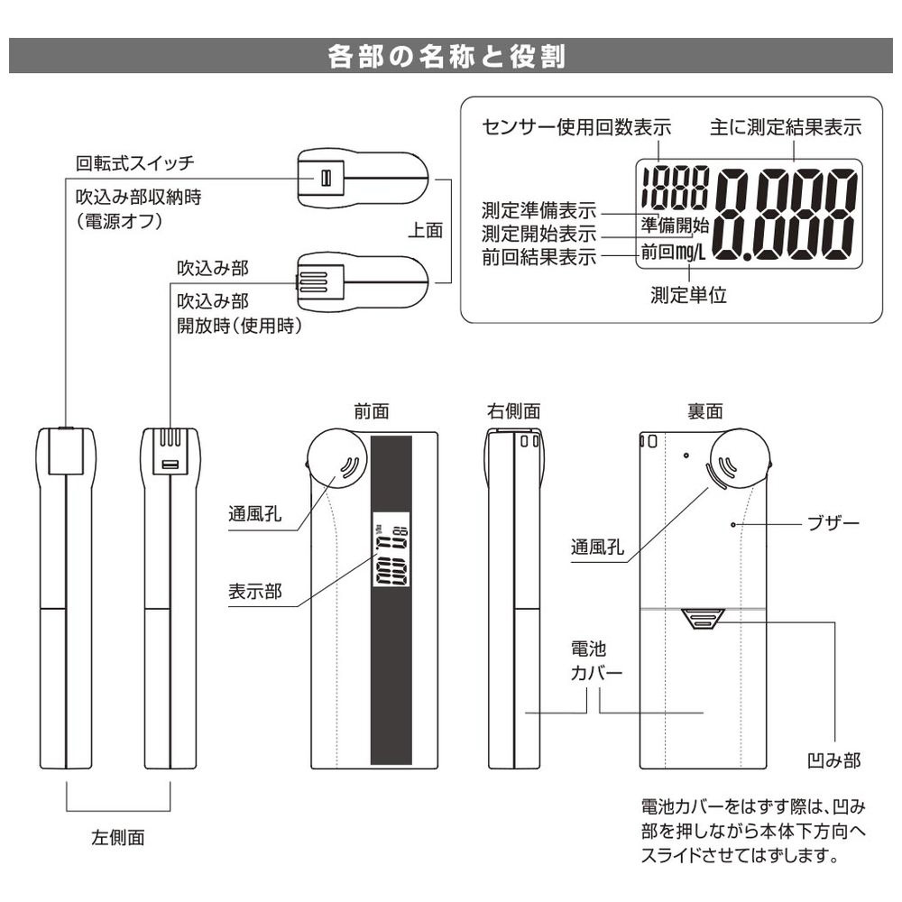 ・吸気中アルコール濃度測定範囲: 0.000〜0.500mg/L(0.025mg/L未満は0.000mg/L表示)