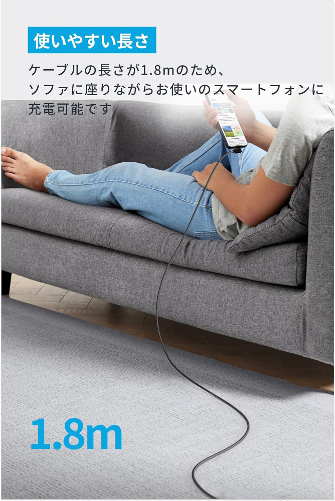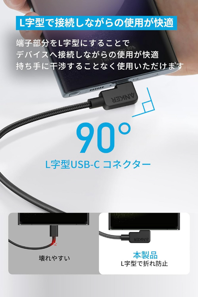 15W出力の高耐久USB-C&USB-Aケーブル。10,000回以上の折り曲げ (Anker調べ) にも耐える優れた耐久性を実現しているため、ケーブル内部のワイヤーを断線から保護し、長くお使いいただけます。
