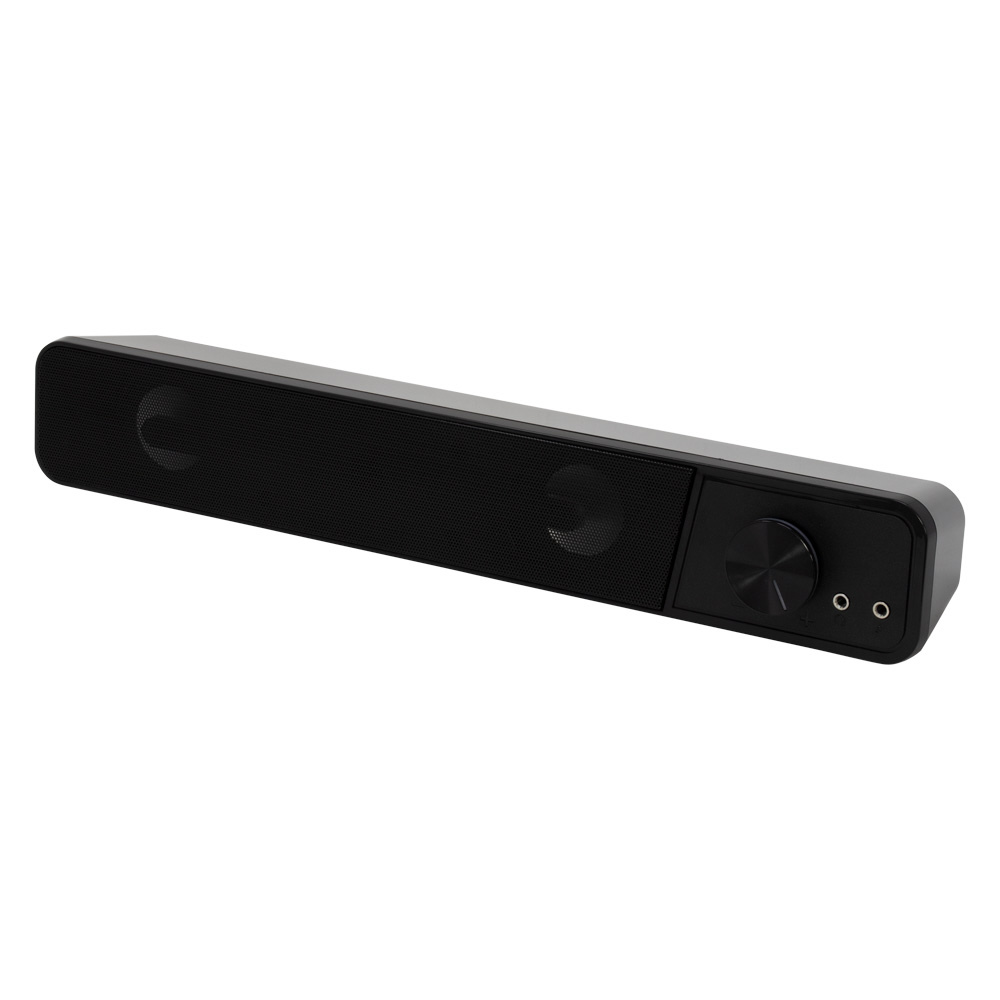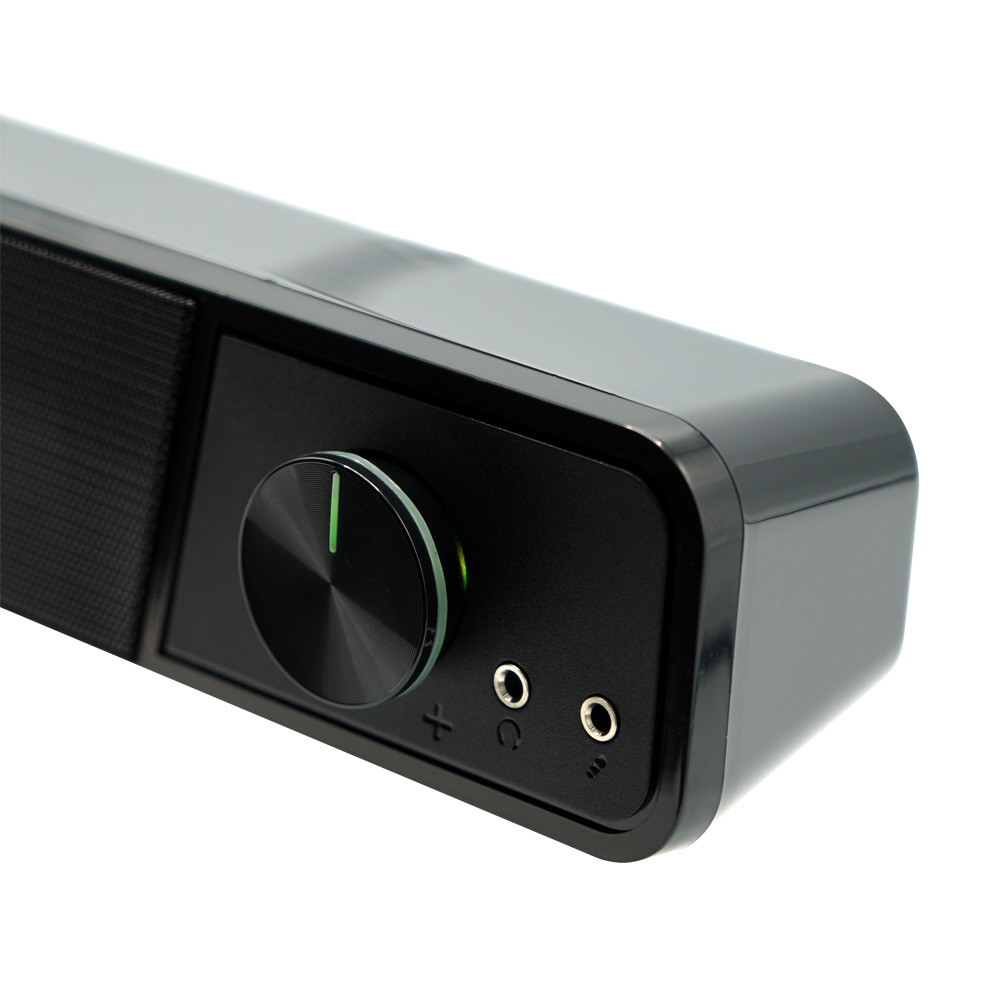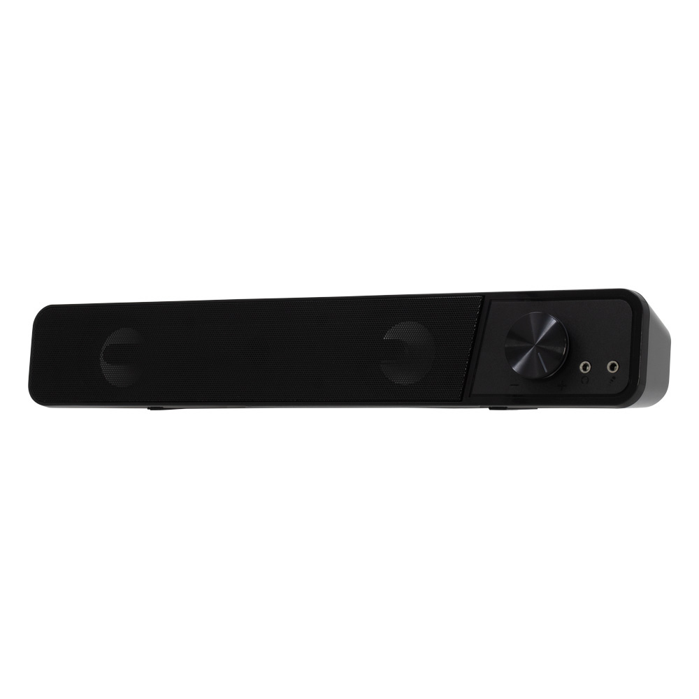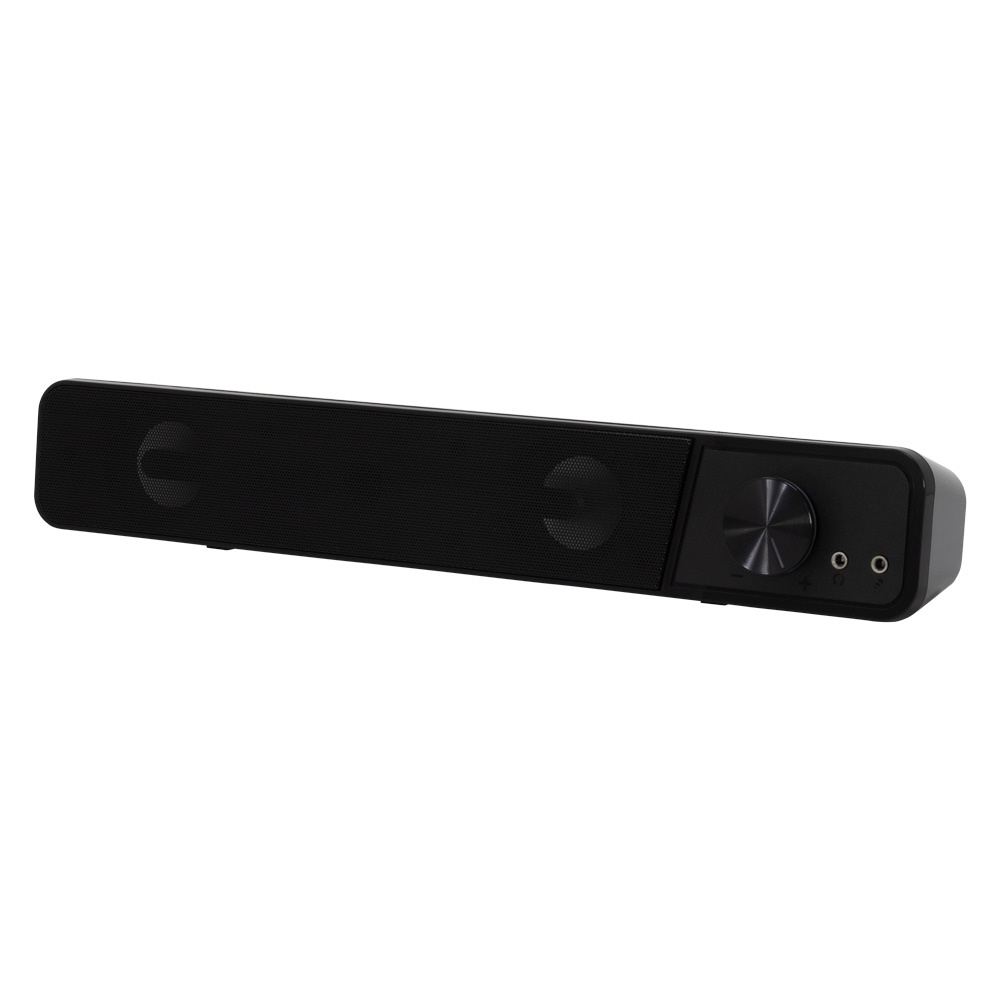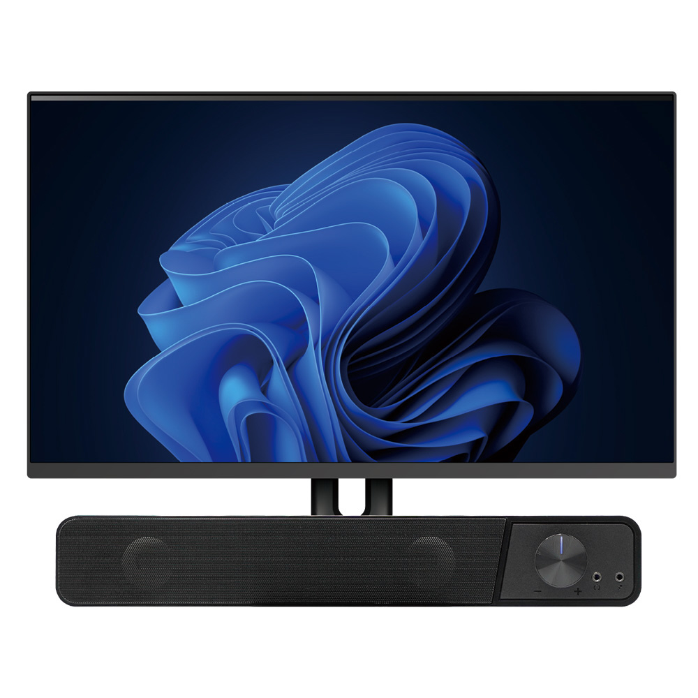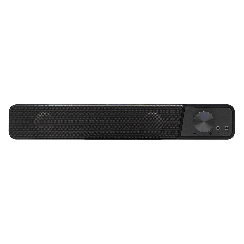 パソコンモニタ下に好適な小型サウンドバースピーカー。ヘッドセットの接続に便利な前面端子を搭載しています。