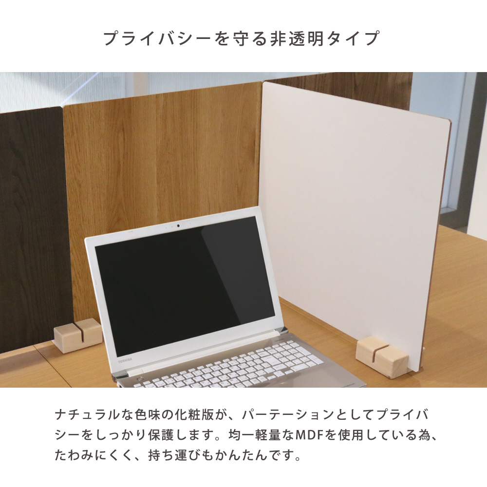 ナチュラルな色味の化粧板が、パーテーションとしてプライバシーをしっかり保護します。均一軽量なMDFを使用している為、たわみにくく、持ち運びもかんたんです。