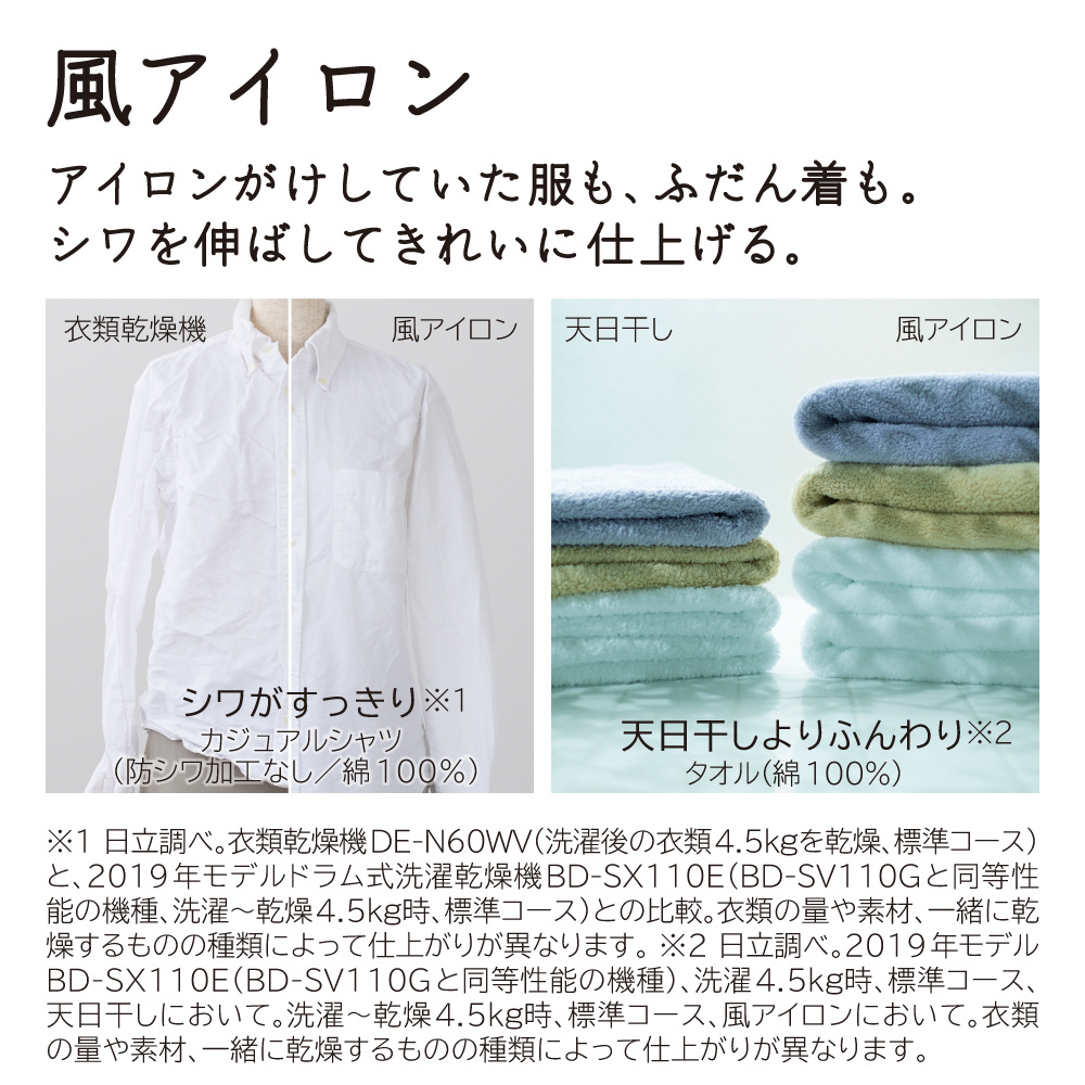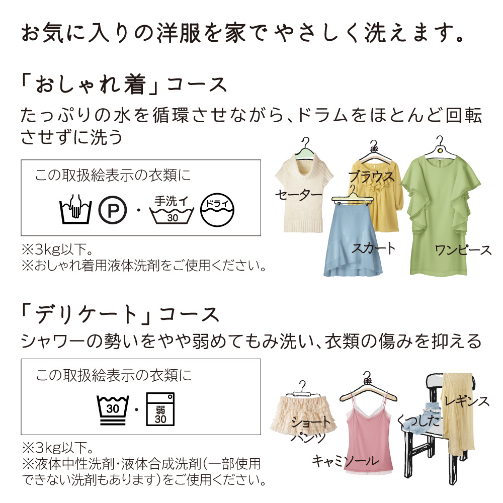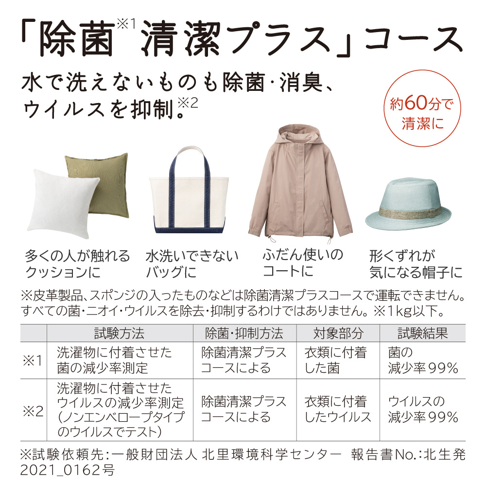 「AIお洗濯」で効率よくきれいに洗濯。「風アイロン」でシワを伸ばしてきれいに仕上げます。「除菌清潔プラス」コースで除菌・消臭・ウイルス抑制、湿気を含んだ温風で衣類を加熱。水で洗えないものにも使えます。