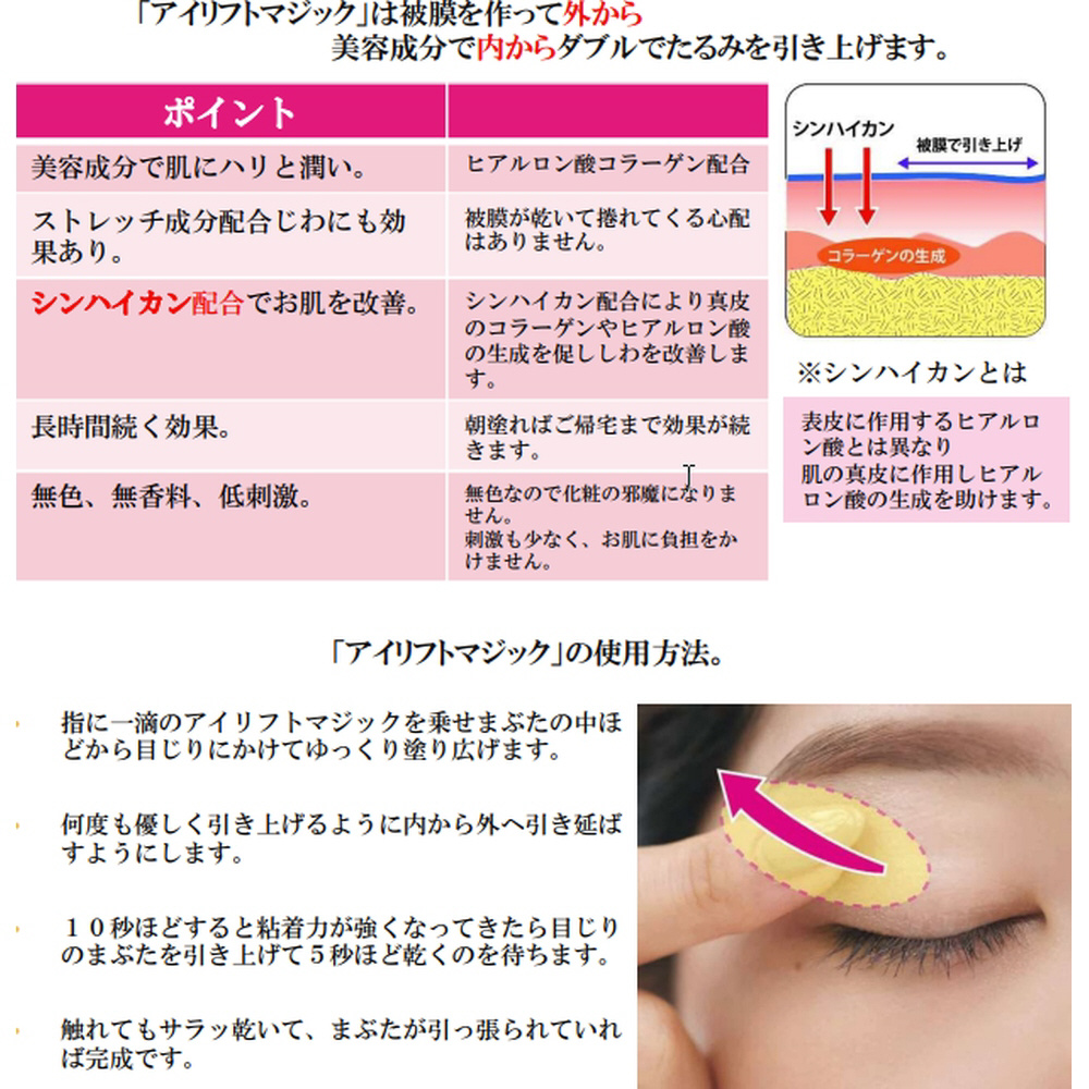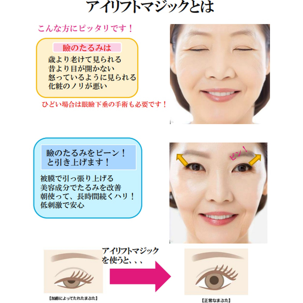 アイリフトマジックは、特に中高年の女性におすすめの「まぶたのたるみ」に効果的な美容液です。年齢とともに張りを失いがちな「まぶた」に働きかけ、被膜によってリフトアップ効果を与えます。