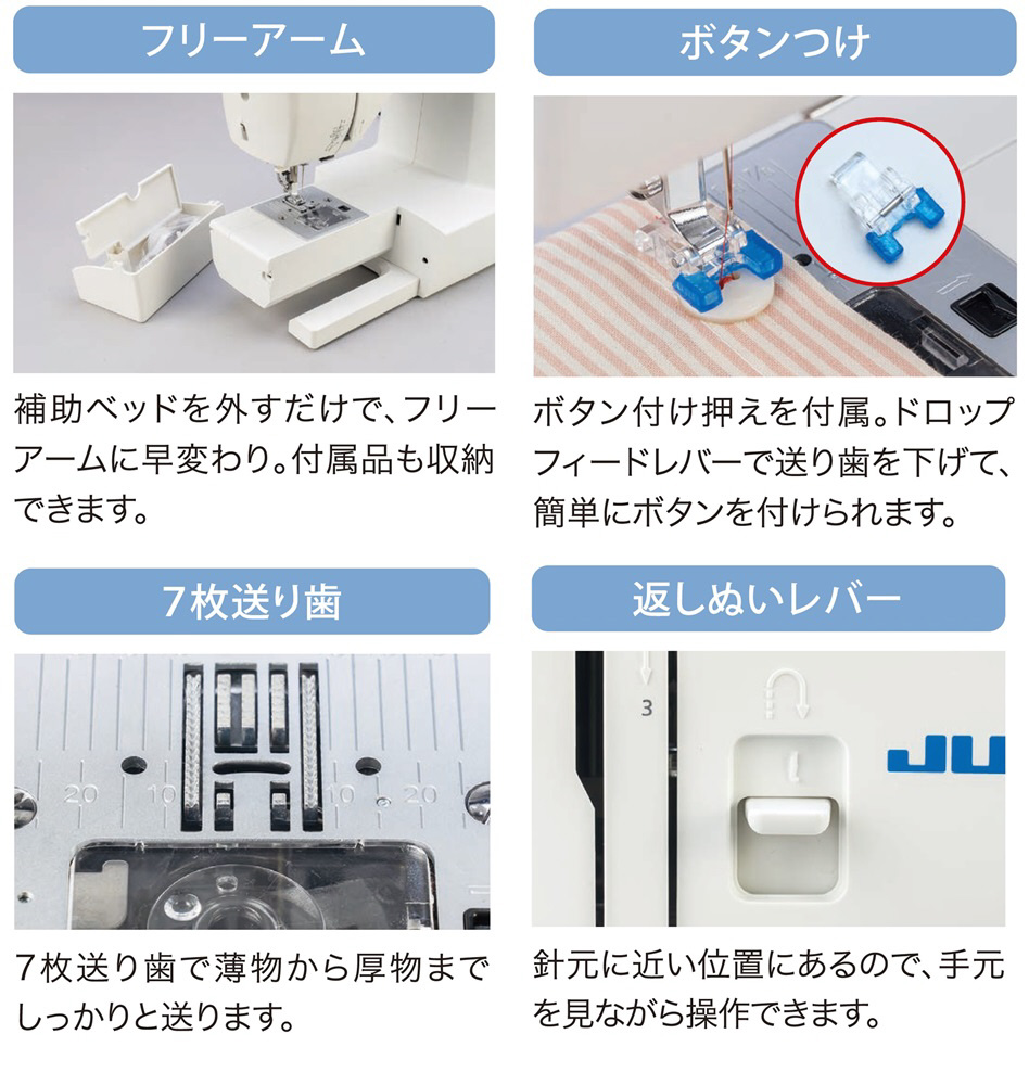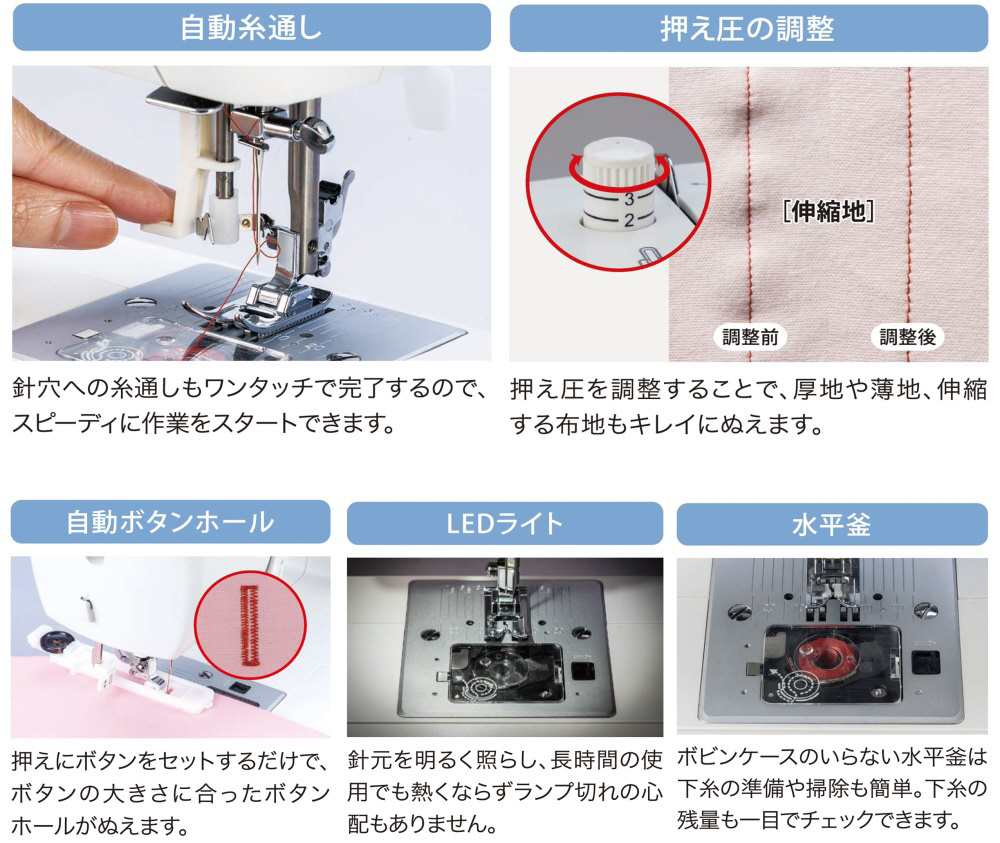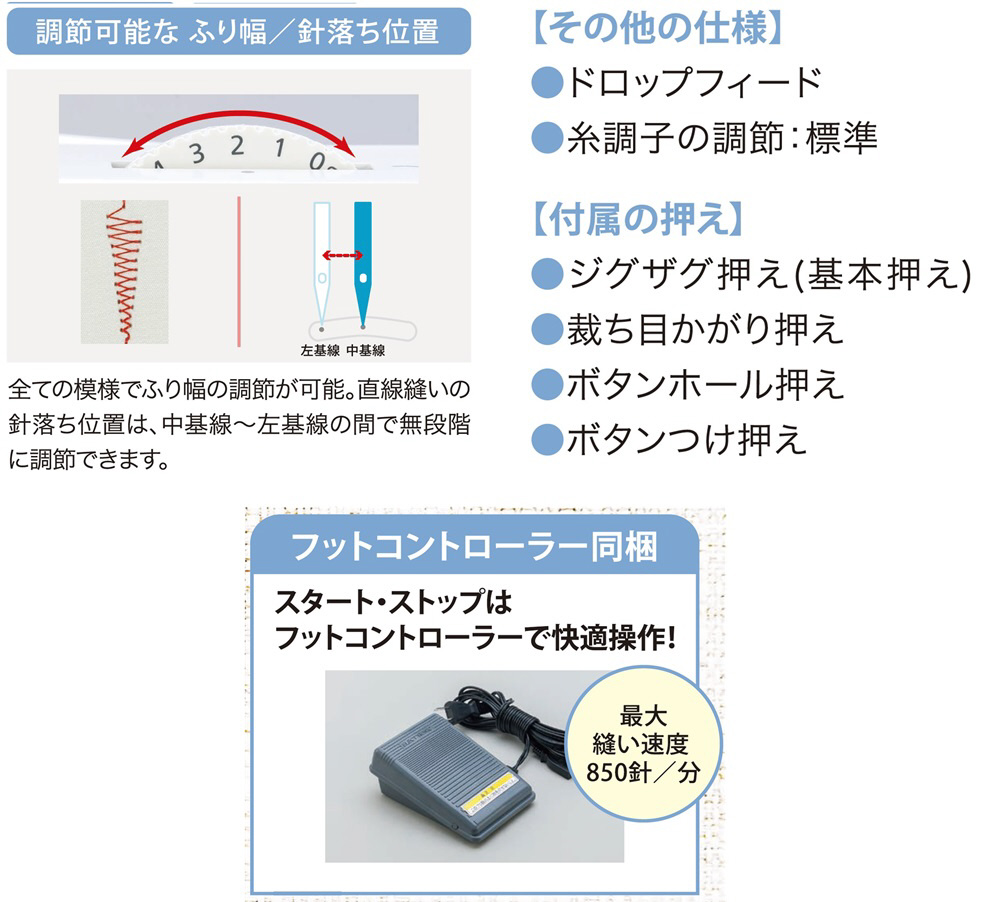 | 付属品 | 基本押え(本体に装着)、ボタン付け押え、裁ち目かがり押え、ボタンホール押え |