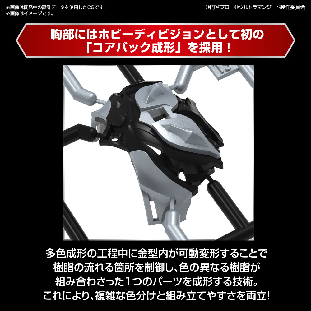 胸部にはホビーディビジョンとして初の「コアバック成形」を採用!「コアバック成形」とは、多色成形の工程中に金型内が可動変形することで樹脂の流れる箇所を制御し、色の異なる樹脂が組み合わさった1 つのパーツを成形する技術。これにより、複雑な色分けと組み立てやすさを両立!