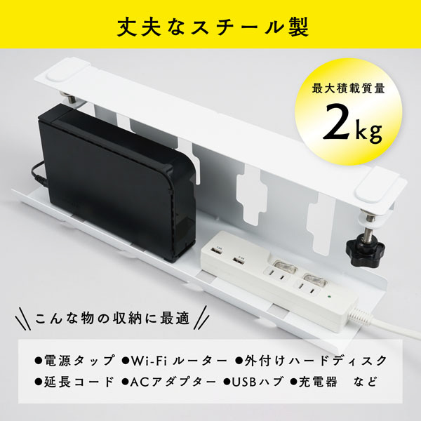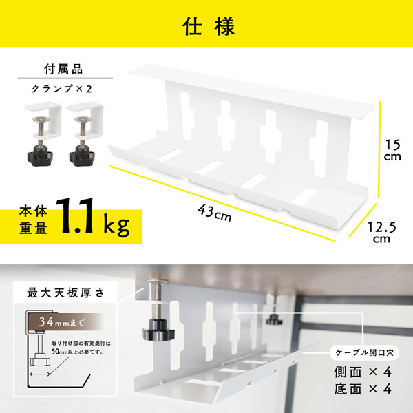 | 仕様1 | [クランプ取り付け条件] 奥行き50mm以上/天面厚さ34mmまで [本体サイズ]W430×L125×H150mm [本体重量]1.1kg [最大積載量]2kg(均等荷重) [ケーブル開口穴]側面×4、底面×4 [付属品]クランプ×2 |