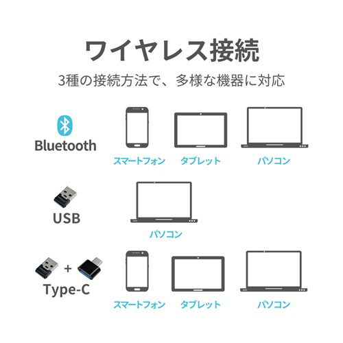 Bluetooth、Type-Aワイヤレス、Type-Cワイヤレス3種類の接続方法に対応し、限られたスペースでの操作やお絵描きなどに最適です。