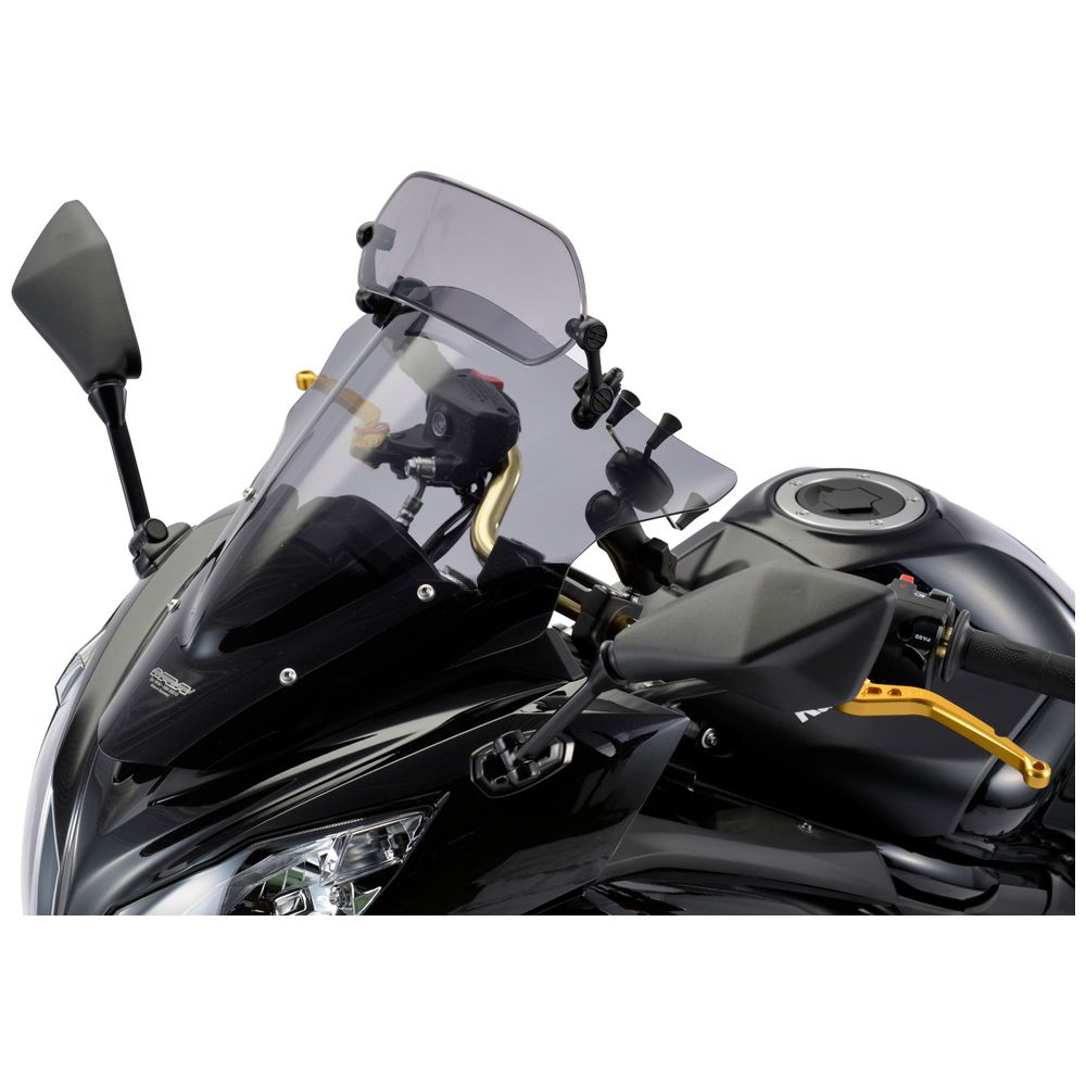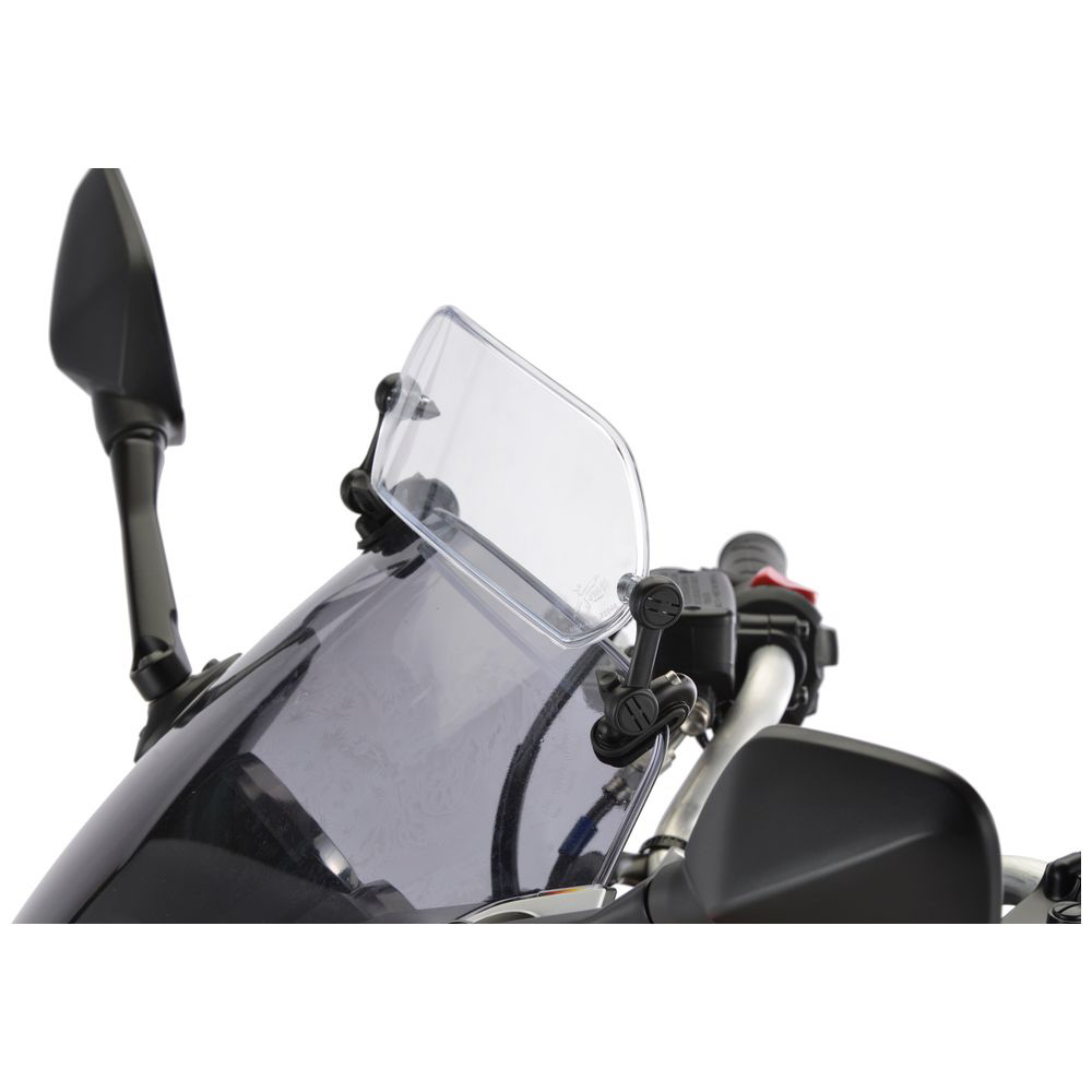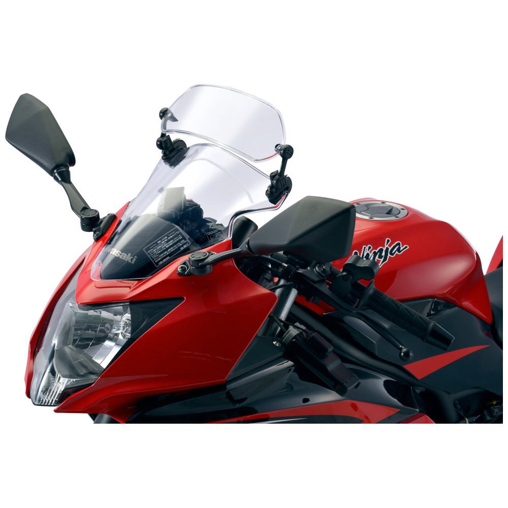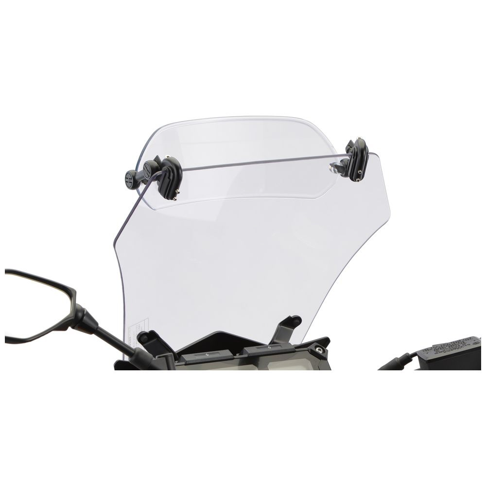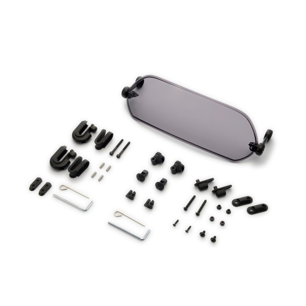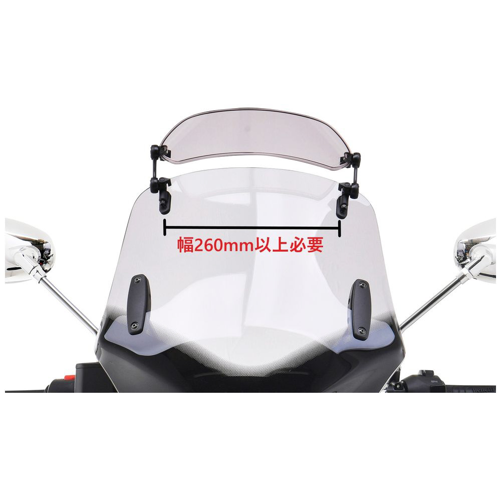 「エクスクリーン スポーツ」は、純正スクリーンやMRAスクリーンに装着できる小型の汎用可変式スポイラーです。プラスアルファの風防が欲しい方やシチュエーションによって整流効果を調整したい方におすすめです。2種類のマウントが付属するため、穴あけ固定でスッキリ・しっかり取り付けるかクリップ固定で着脱式にするかを選択可能です。フルカウルやスポーツタイプのバイクに最適。