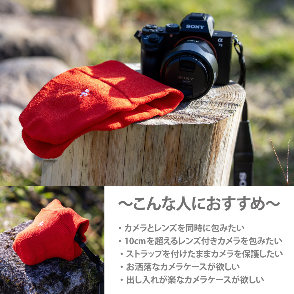 カメラとレンズを、ストラップから下げたままピッタリと包むことができます。