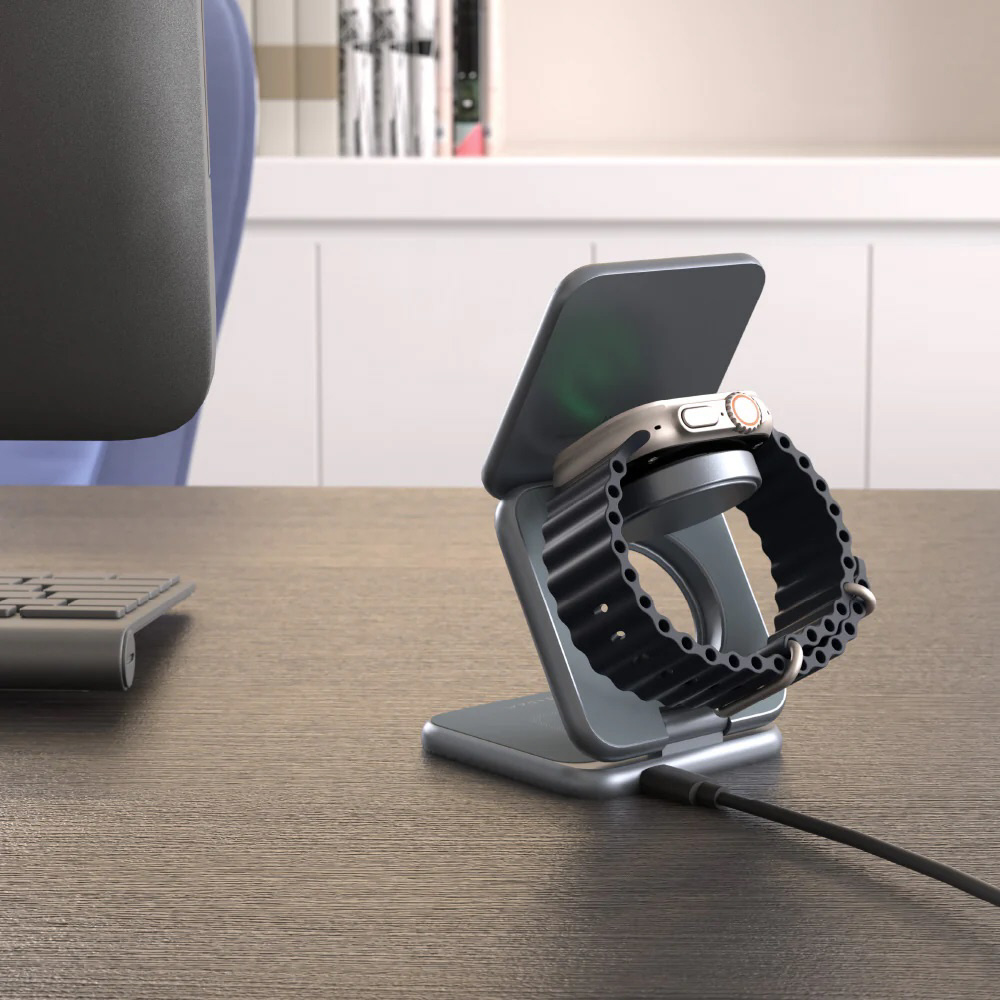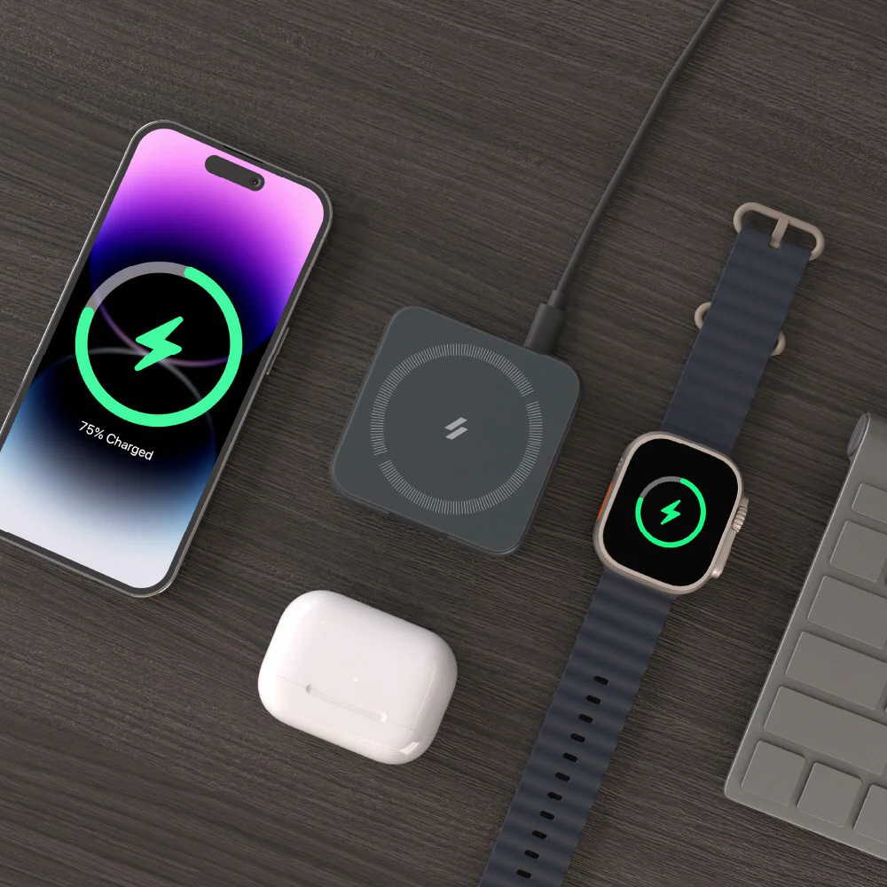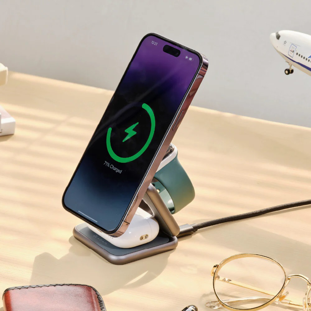 MagSafe対応のiPhoneシリーズ、ワイヤレス充電対応のAirPodsシリーズ、Apple Watchシリーズを3台同時に充電できる充電スタンドです。
