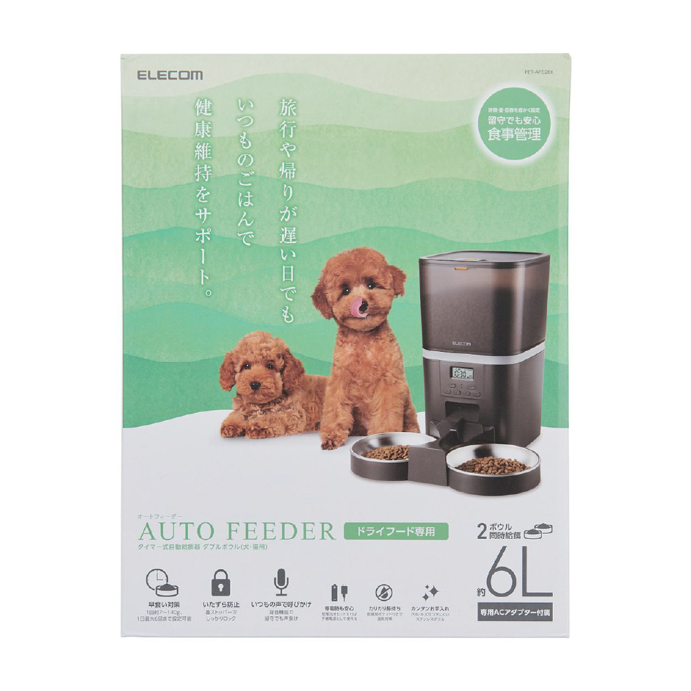 お留守番のときも、いつものごはんを同じように。給餌のタイミングや量を最大20パターンまで設定でき、規則正しい食生活でワンちゃん・ネコちゃんの健康維持をサポートするタイマー式自動給餌器です。多頭飼いでも安心の2皿タイプです。 ※本製品はドライフード専用です。