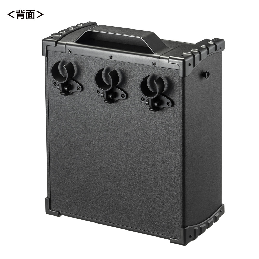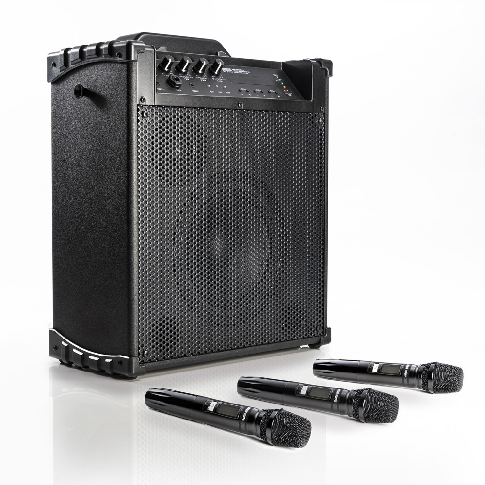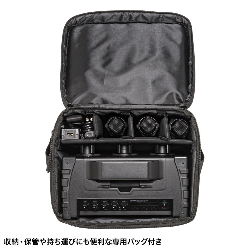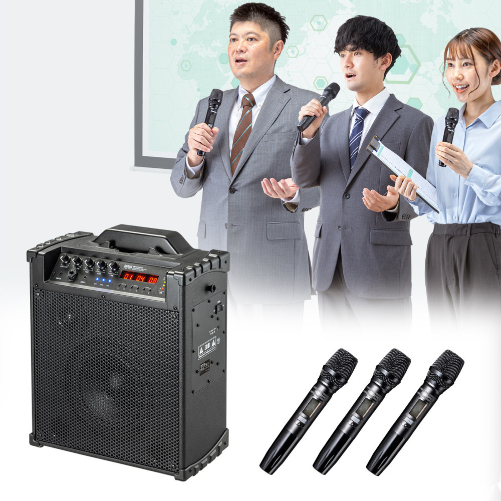 ワイヤレスマイク3本の同時使用に対応し、電源がない環境でも動作するバッテリー内蔵のワイヤレスマイク付き拡声器スピーカー。