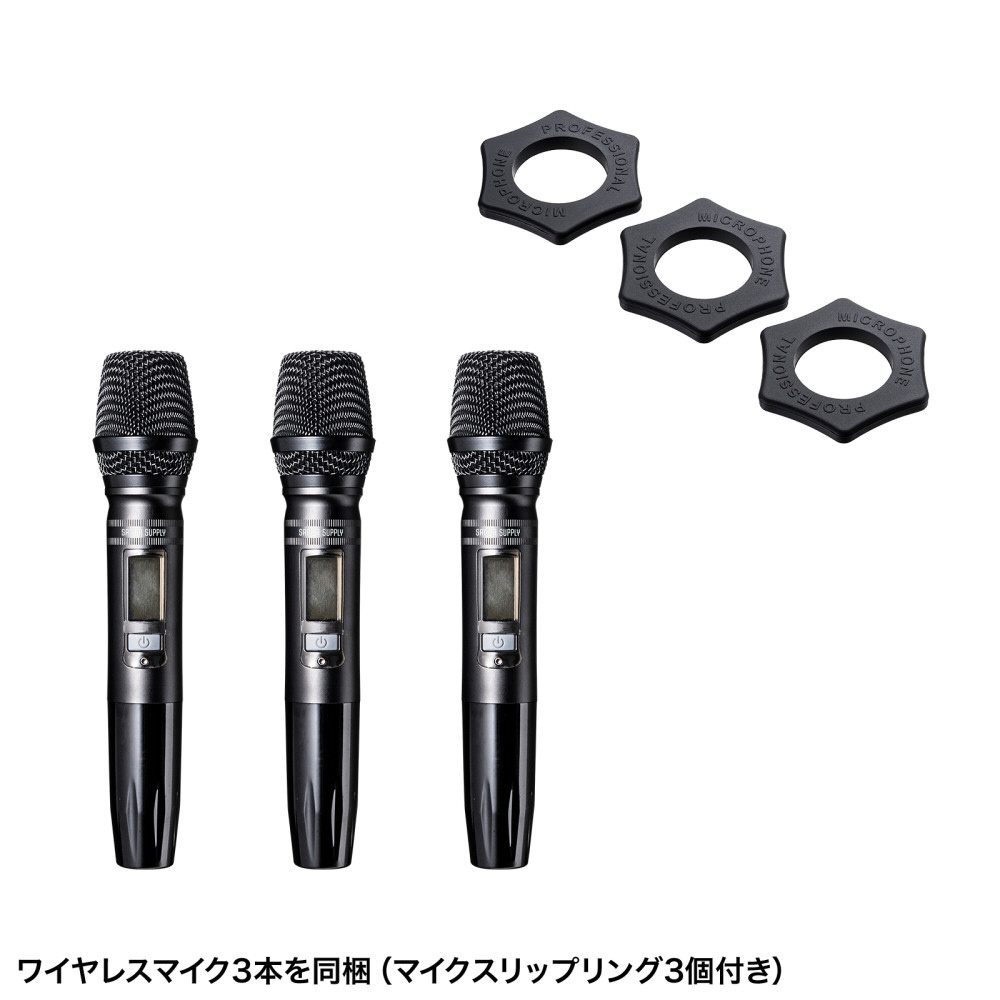 ●ワイヤレスマイク3本を同梱しており自由に移動しながらの同時使用が可能です。別売りの有線マイクを追加することで最大マイク4本まで同時利用することが可能です。