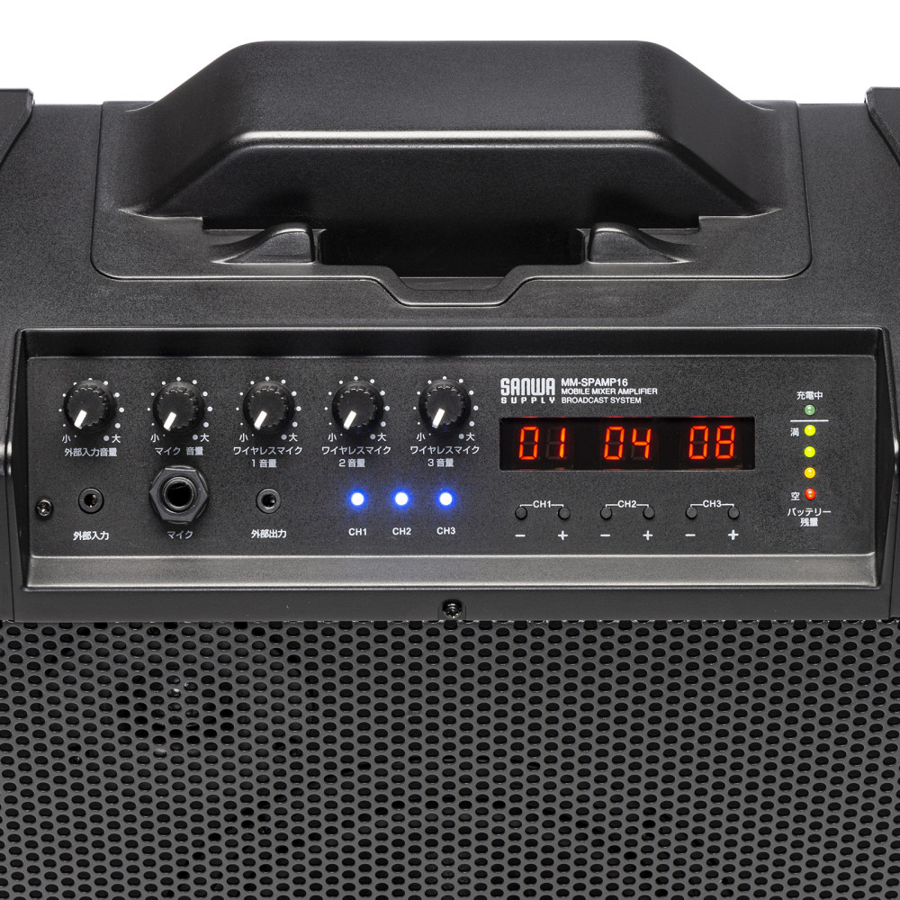 商品名 | ワイヤレスマイク付き拡声器スピーカー(バッテリー内蔵・ワイヤレスマイク3本対応) MM-SPAMP16 |