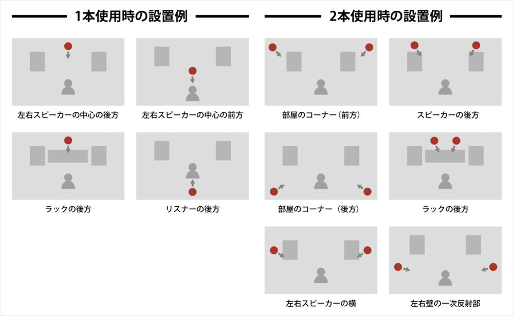 部屋のコーナーやスピーカーの近く、オーディオラックの裏など定在波が溜まりやすい箇所に置くだけで定在波を解消し、見通しの良い透明感溢れる高音質を実現します。