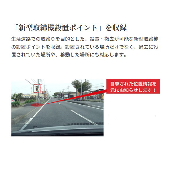 新規に設置された取締機の場所や、検問が目撃された場所の位置情報などをセルスターのスタッフが独自に調査、GPSデータとしてまとめ、ASSURAユーザーだけに月に1度、無料で配信しています。