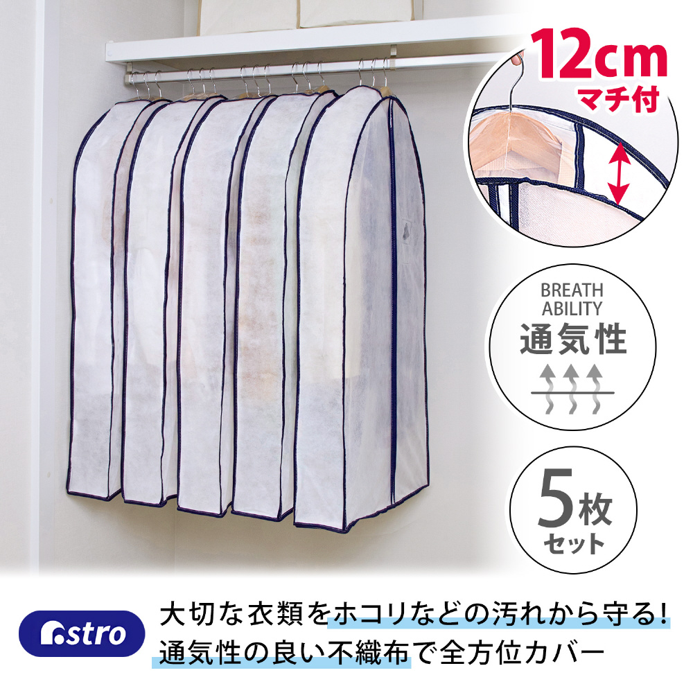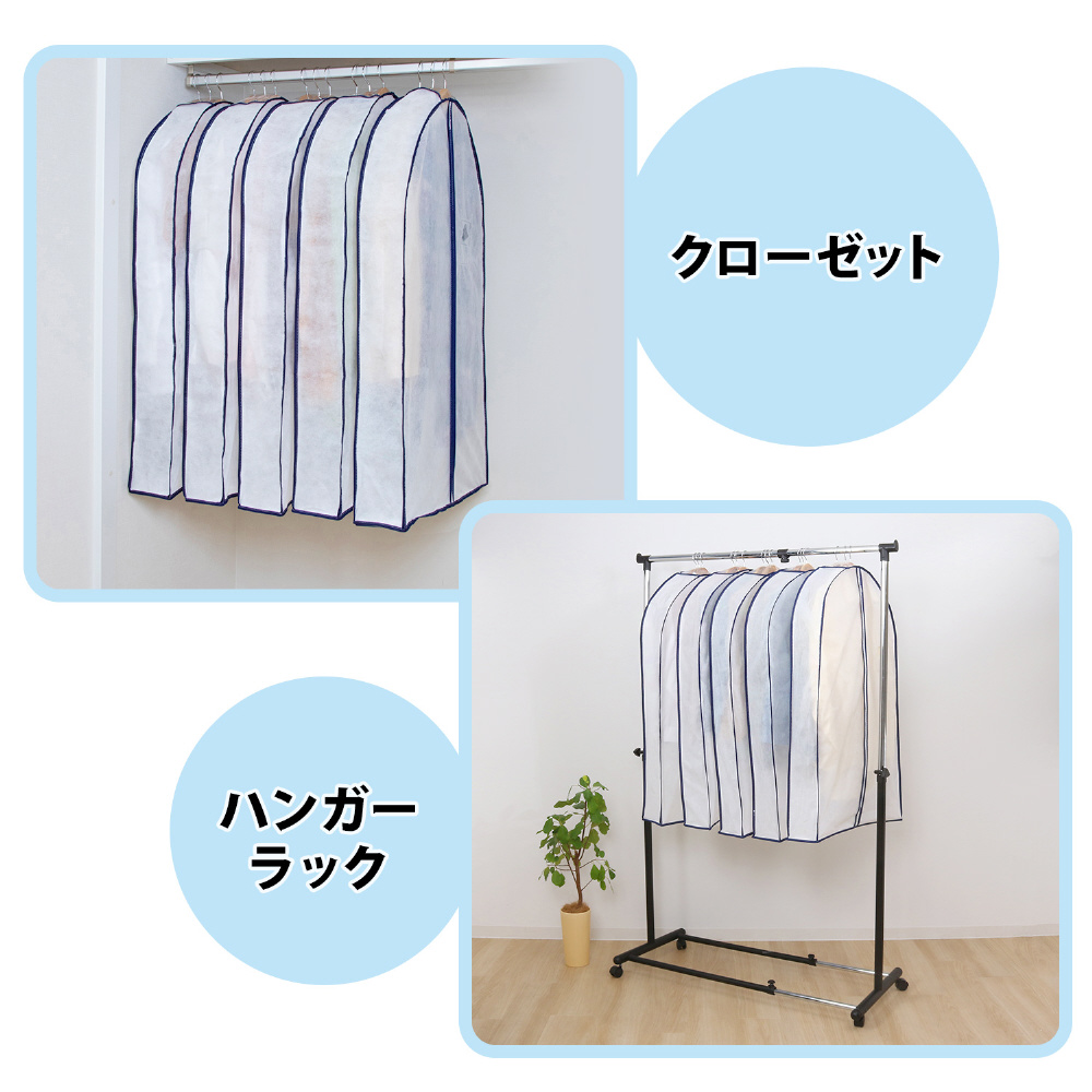 サイズ/約幅60×長さ105×マチ12cm、カラー/ホワイト、内容/5枚、材質/ポリプロピレン・ポリエチレン、収納目安(カバー1枚あたり)/薄手の衣類なら約3〜5枚(ハンガーの厚みにより異なる。)