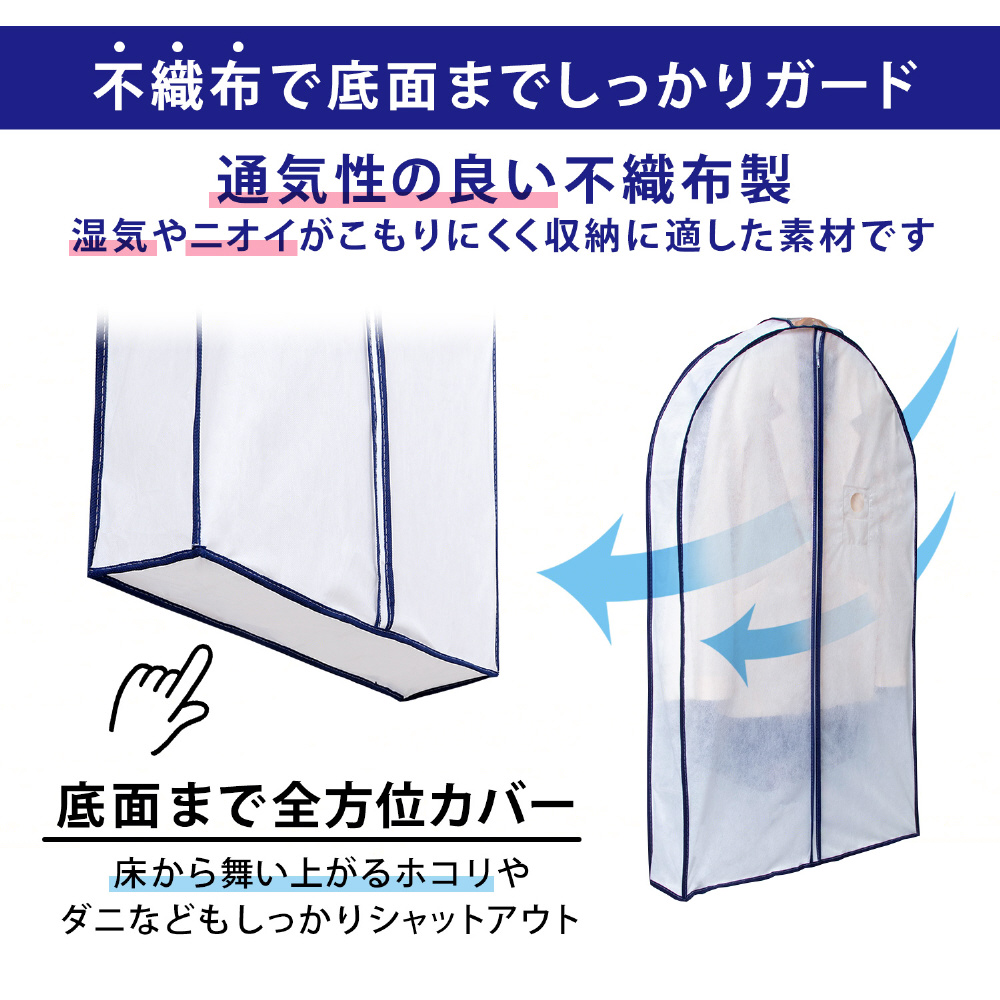 シワをつけたくない大切な衣類を吊り下げたままホコリや汚れから守る衣類カバー。幅広マチ付きで厚手の衣類や複数枚の洋服をまとめて収納可能。