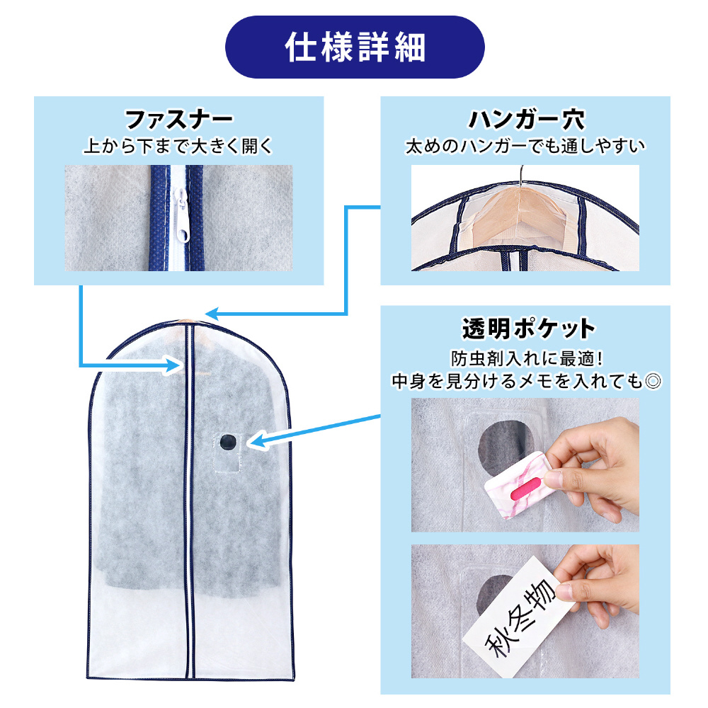 大きく開いて出し入れしやすいセンターファスナー。ハンガーに掛けたまま衣類の出し入れができる。中身の見える透明窓と防虫剤用ポケット付き。透明の防虫剤用ポケットなので取り替えサインが一目で分かる。ネームホルダーとして中の衣類のメモを入れてもOK。