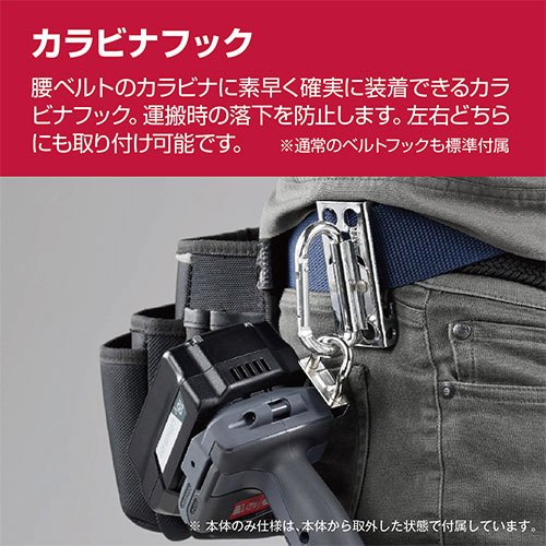 ■運搬時の落下防止のために腰ベルトのカラビナに装着できるカラビナフックを標準付属しています(左右どちらでもセットできます)。