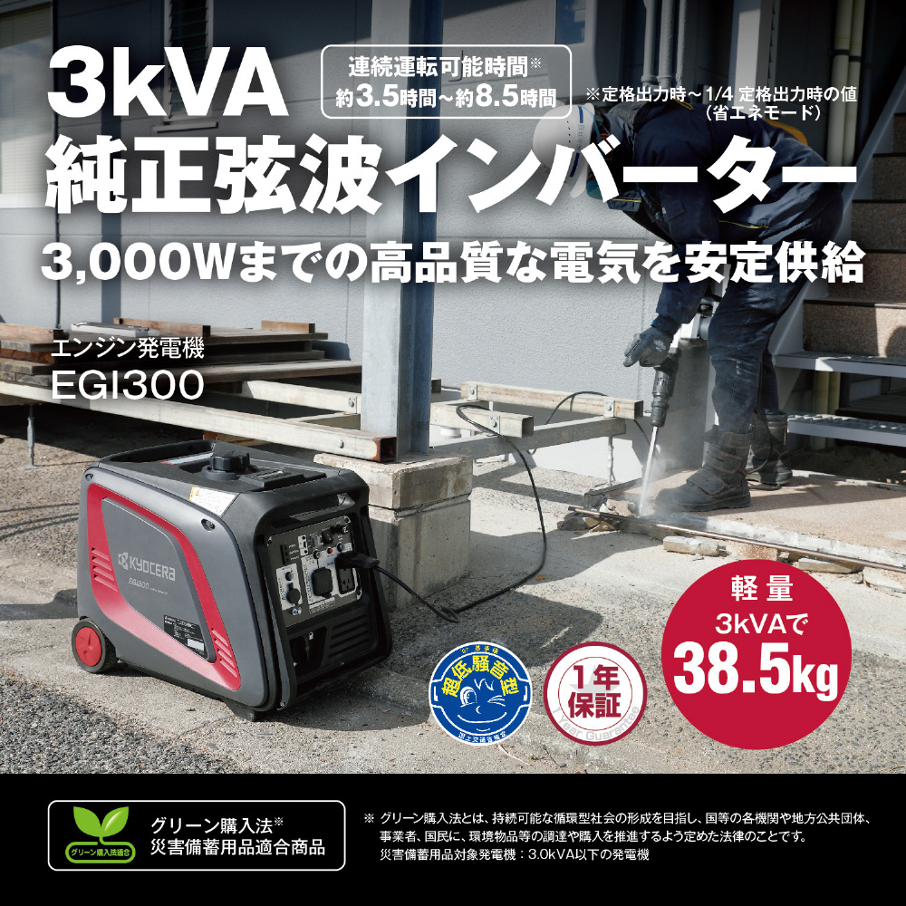 家庭用機器も使える正弦波インバーター&超低騒音仕様、グリーン購入法及びPSE規格に適合したエンジン発電機です。