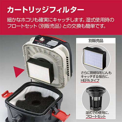 ■コンパクトで着脱しやすいフラットな形状(箱型)の新規カートリッジフィルターを採用しており製品もコンパクトで自動チリ落とし機構を採用しておりフィルターの目詰まりがしにくく、パワーが持続します。