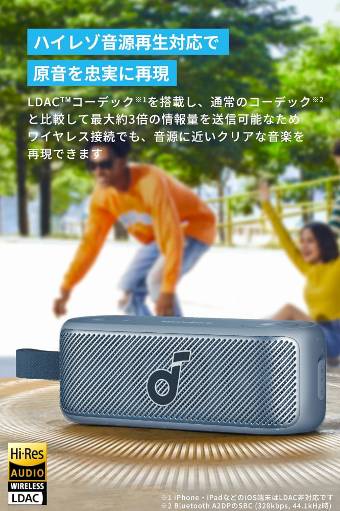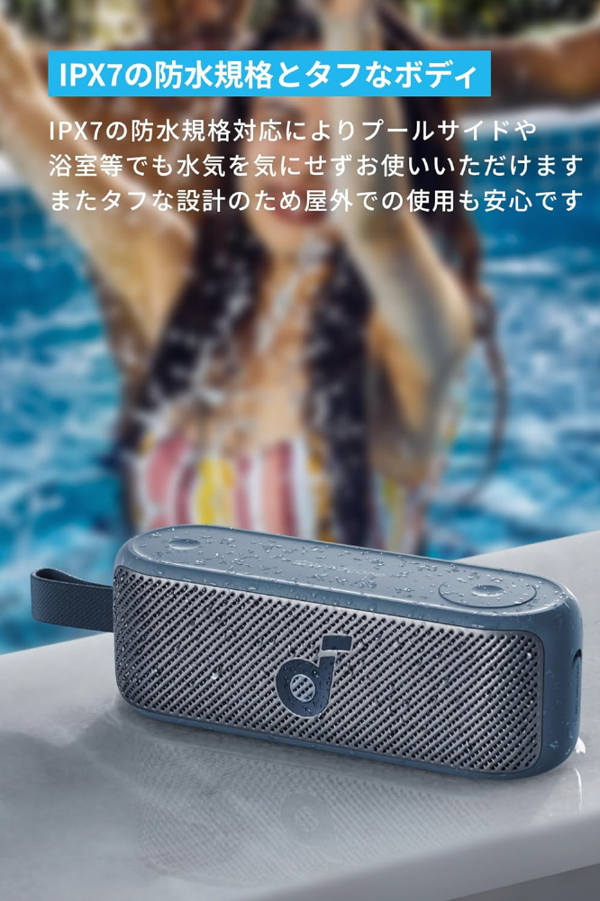 IPX7防水仕様で、アウトドアに最適。シリーズで最もコンパクトなポータブルスピーカー