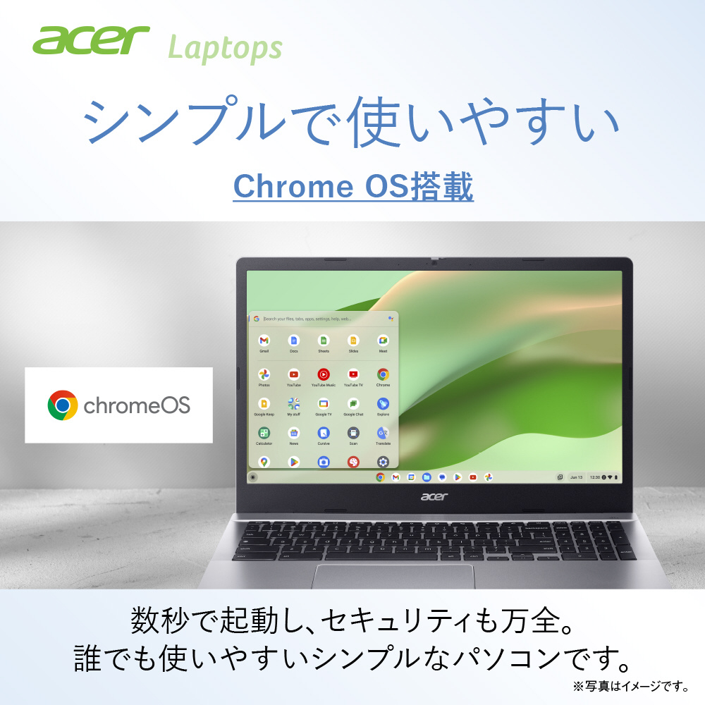高速起動でシンプル、ウイルス対策などのセキュリティも万全なChrome OSを搭載。Google アカウントにログインすれば自分だけの環境にすぐアクセスできます。