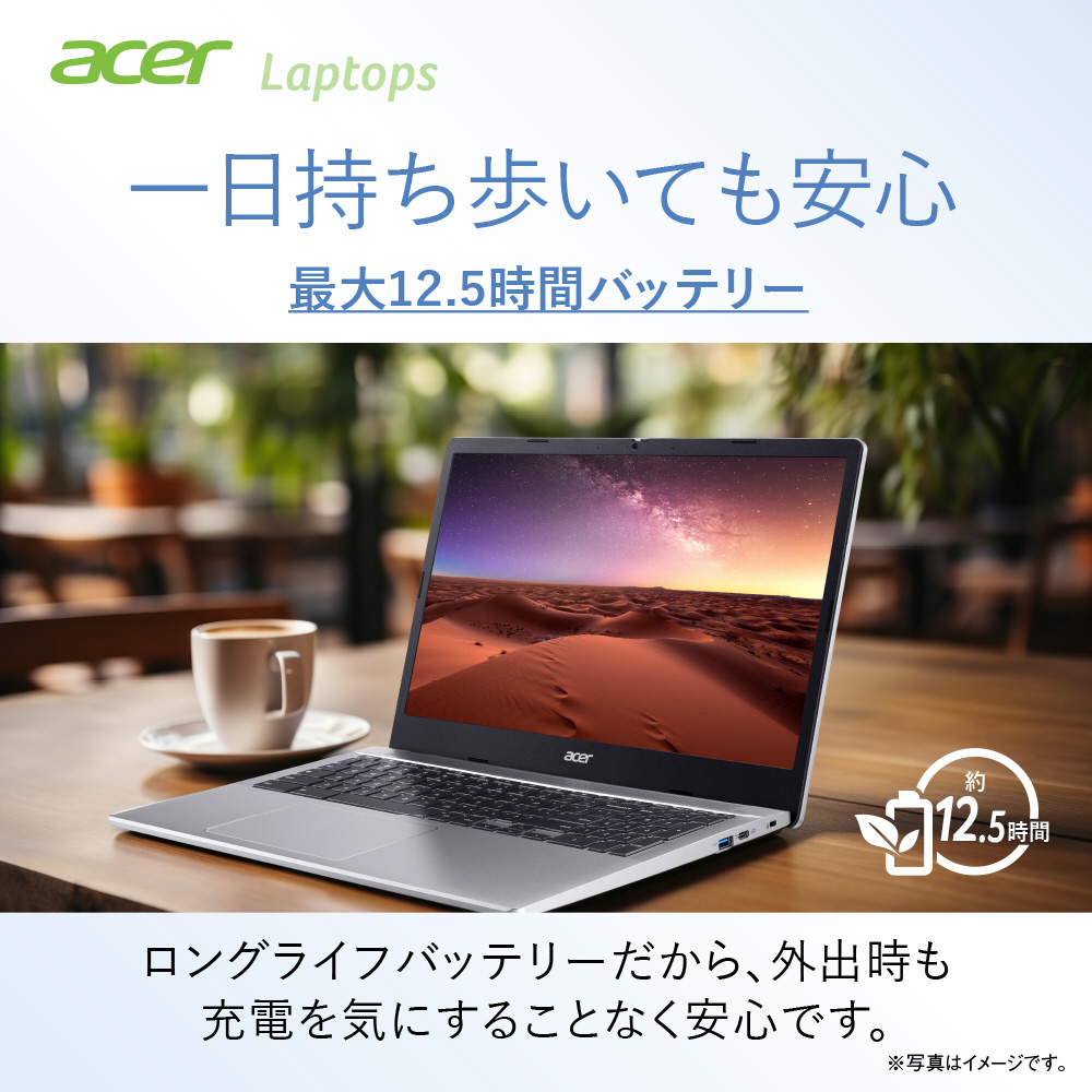 1回の充電で最長約12.5時間連続駆動が可能なバッテリーにより、アダプターを持たずに持ち歩いても、安心してお使いいただけます。