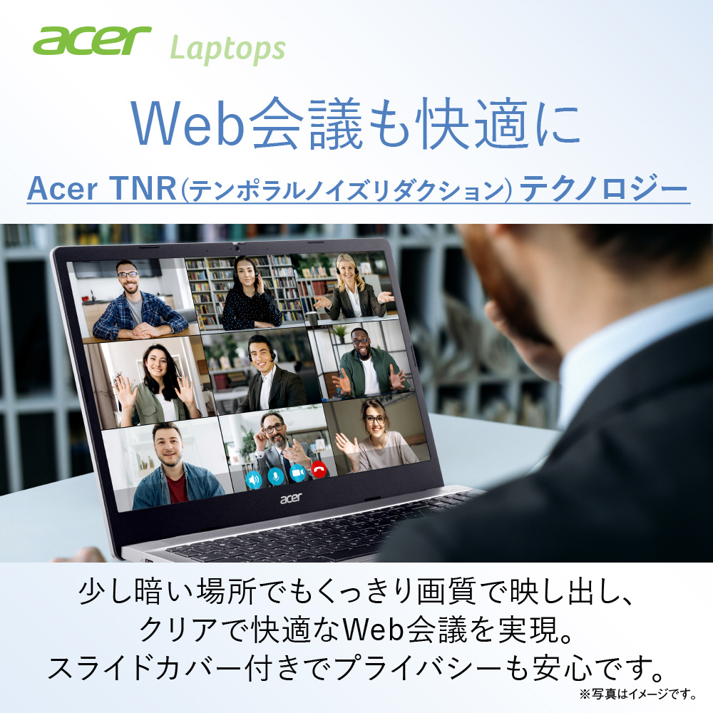 HD Webカメラには、Acer TNR (テンポラルノイズリダクション) テクノロジーを搭載。少し暗い場所でもくっきり画質で映し出し、クリアで快適なWeb会議を実現します。スライドカバー付きでプライバシーも安心です。