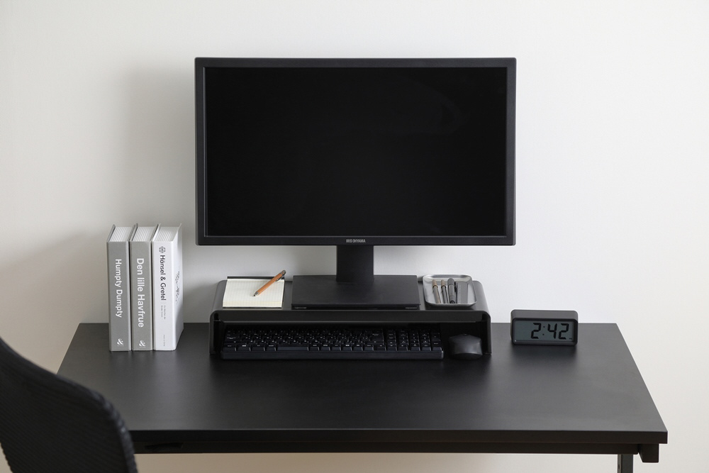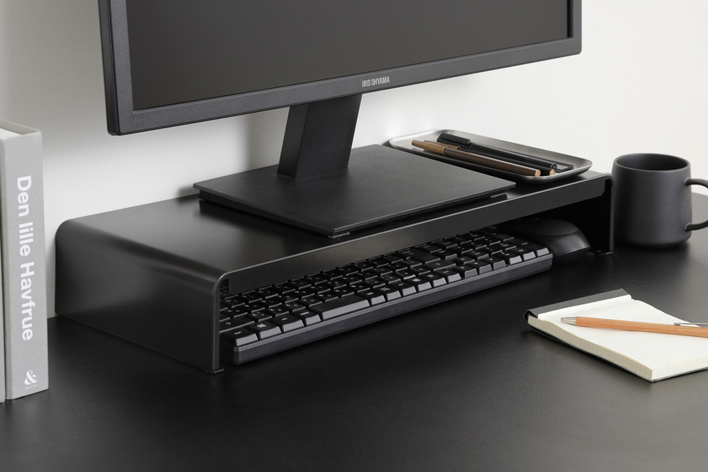 シンプルなデザインでどんなデスクにも合うモニター台です。モニター台を使って目線を上げることで姿勢が改善され、首や肩、腰への負担が軽減されます。キーボードやマウスを収納し、作業スペースを広く使うことができます。背板がないので、配線作業も簡単です。シンプルなデザインなので、収納ラックやプリンター台としても使用できます。サビやキズに強く、頑丈なオールスチール製です。