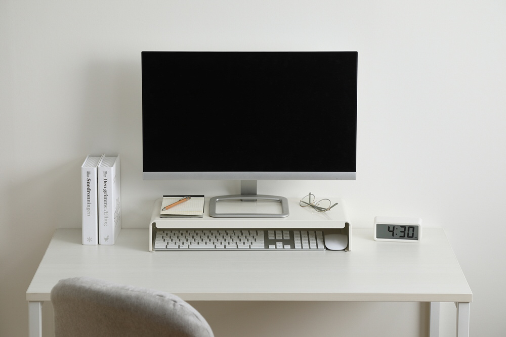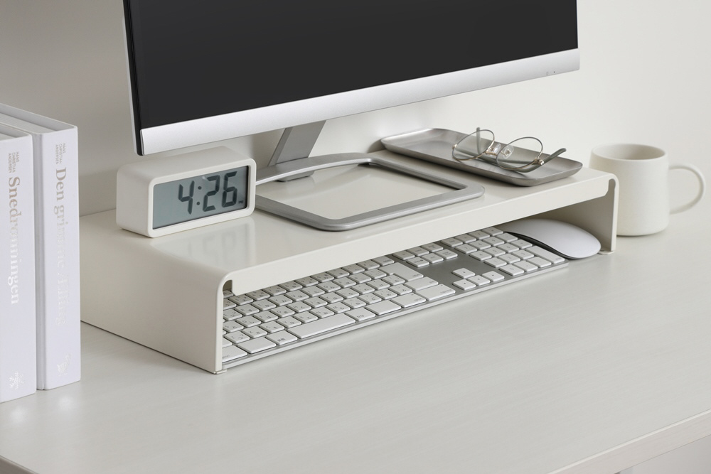 シンプルなデザインでどんなデスクにも合うモニター台です。モニター台を使って目線を上げることで姿勢が改善され、首や肩、腰への負担が軽減されます。キーボードやマウスを収納し、作業スペースを広く使うことができます。背板がないので、配線作業も簡単です。シンプルなデザインなので、収納ラックやプリンター台としても使用できます。サビやキズに強く、頑丈なオールスチール製です。