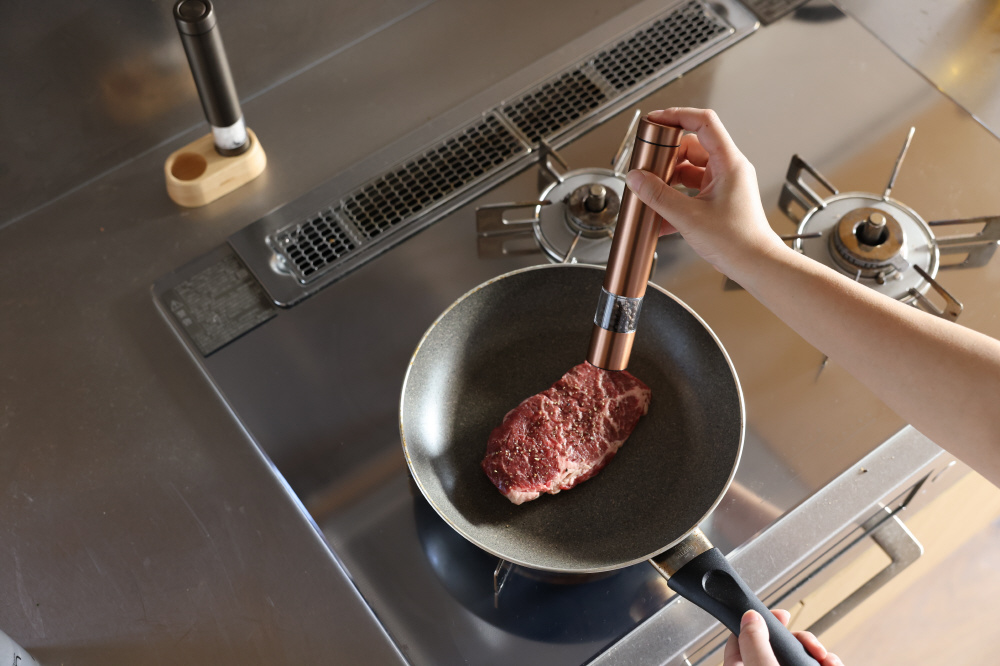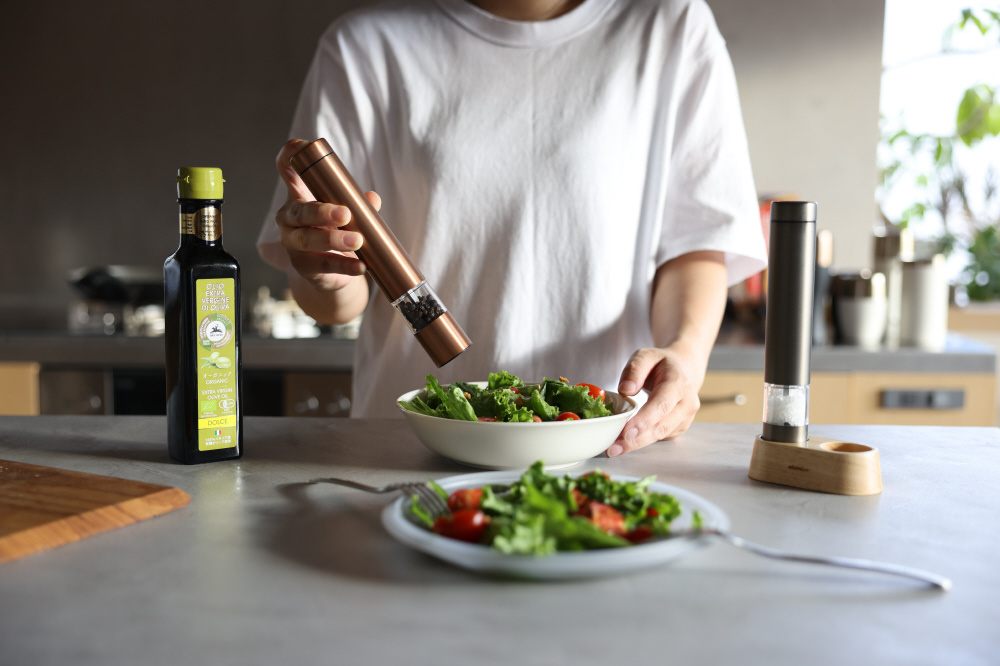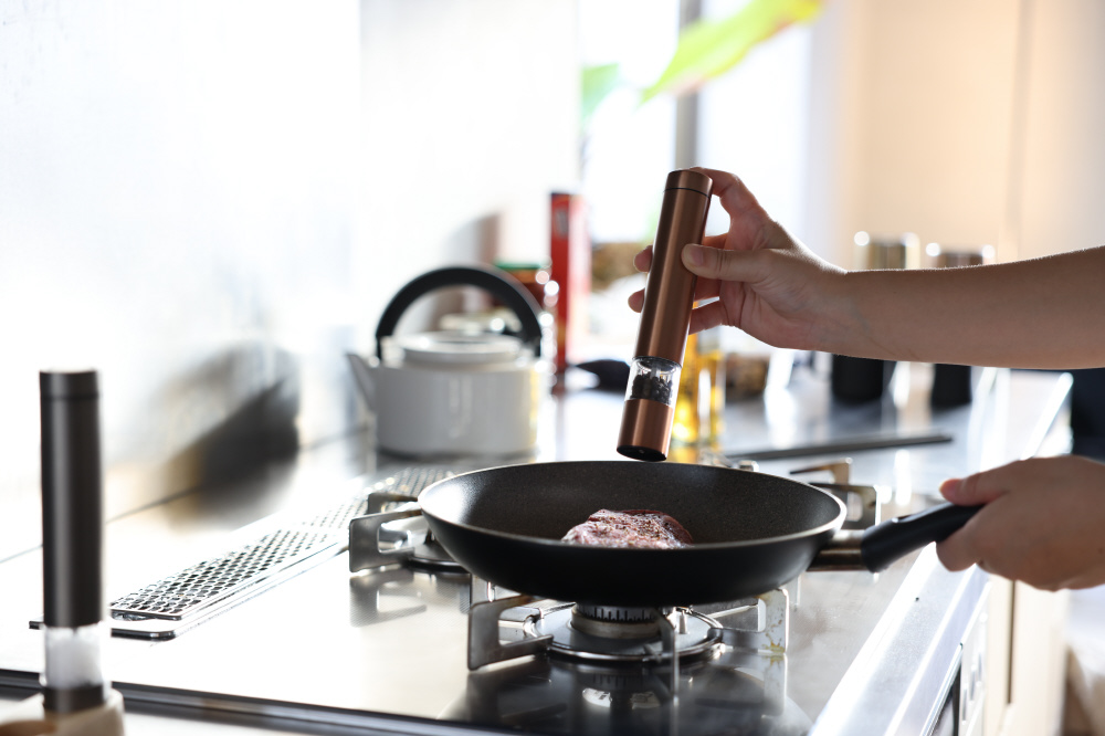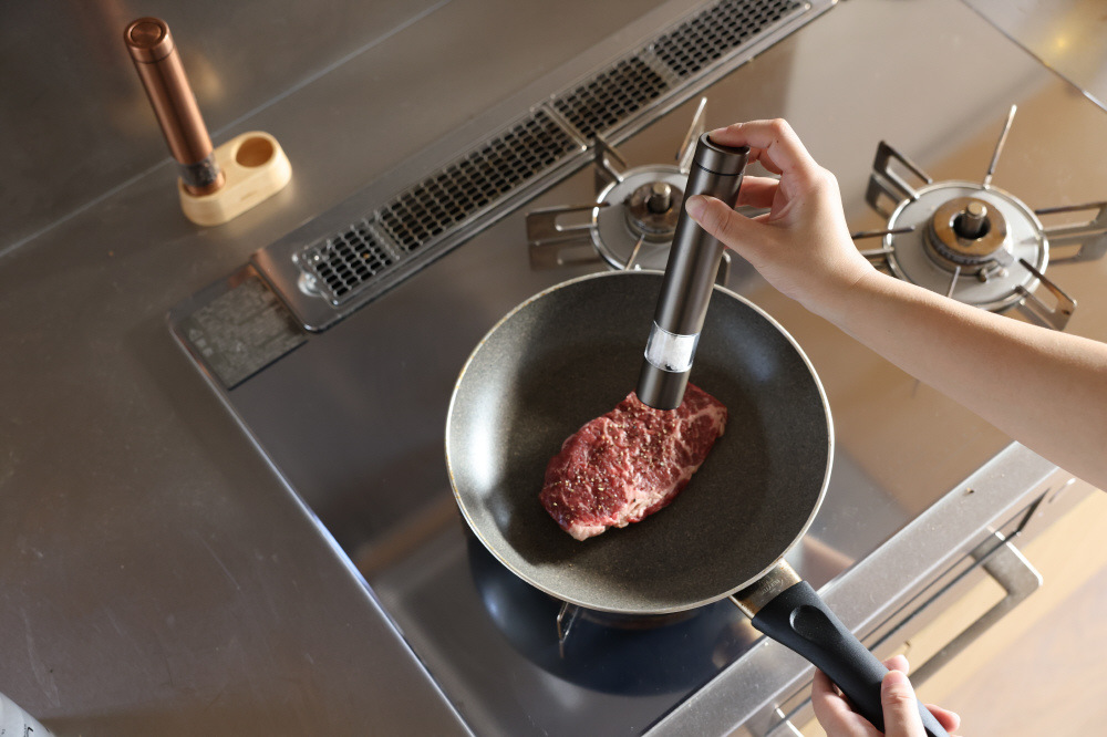 料理中でも手を休めることなく、さっと片手で塩・胡椒などの味付けが完了。