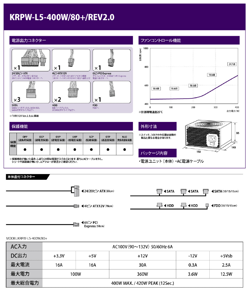 PC電源 KRPW-L5 REV2.0シリーズ KRPW-L5-400W/80+/REV2.0 [400W /ATX /Standard]