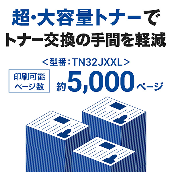 約5,000ページ印刷可能な超・大容量トナーに対応。トナー交換の手間を軽減しカートリッジ廃棄量の削減にもつながります。