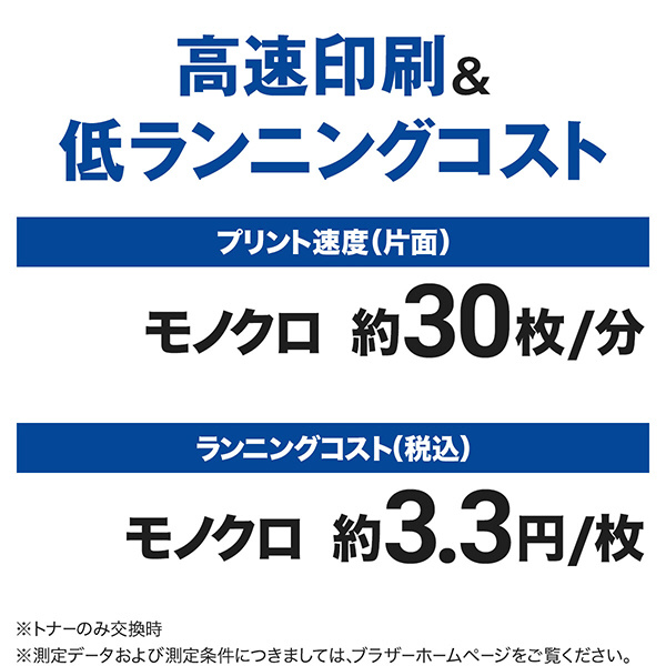 | 印刷速度 | 片面(A4)モノクロ:約30枚/分、両面(A4)モノクロ:約15ページ/分 |