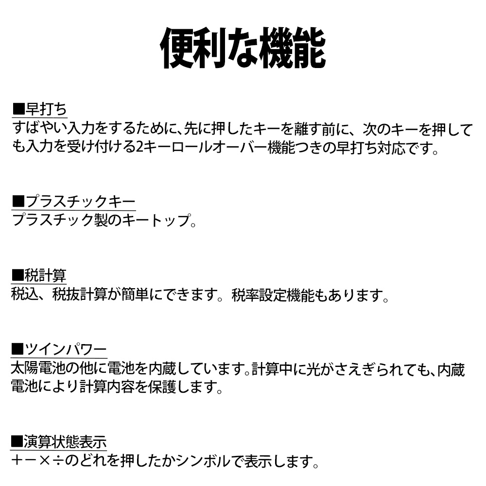 | 付属品 | アルカリボタン電池1個(本体内蔵)、取扱説明書、税率設定シール |