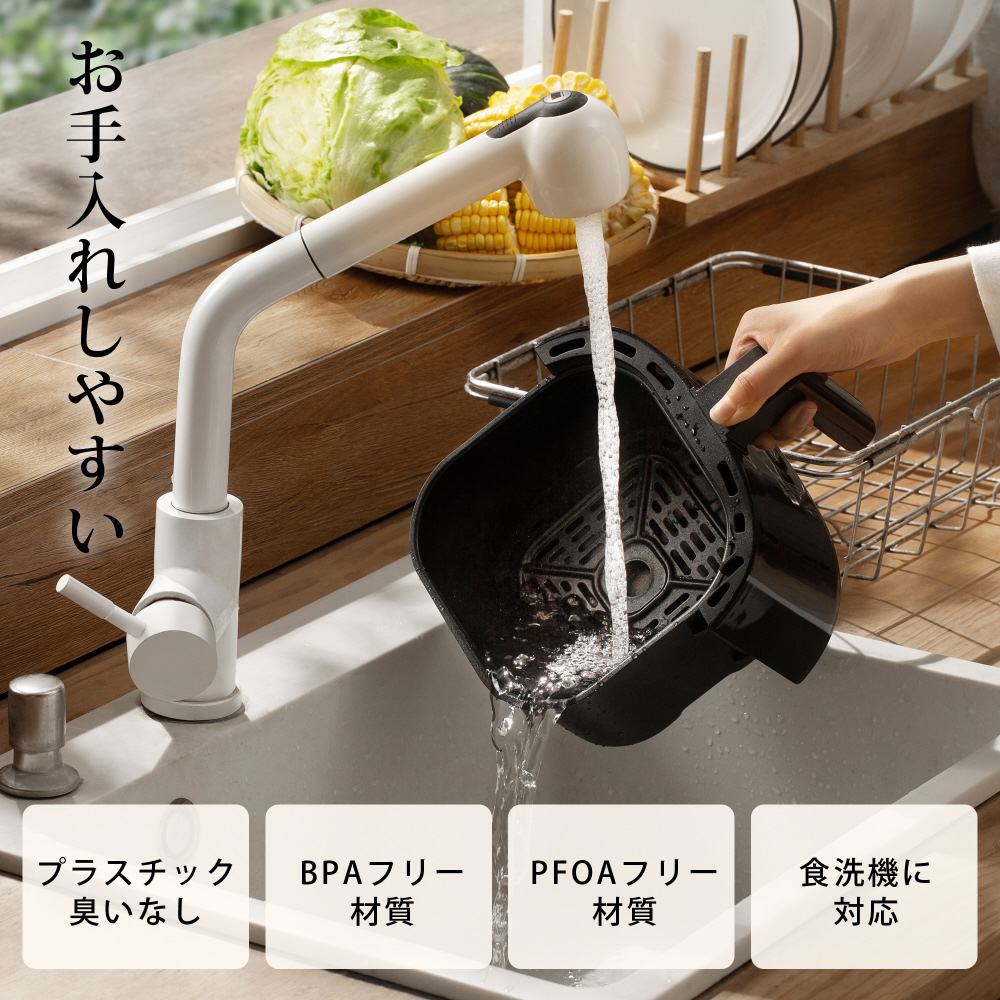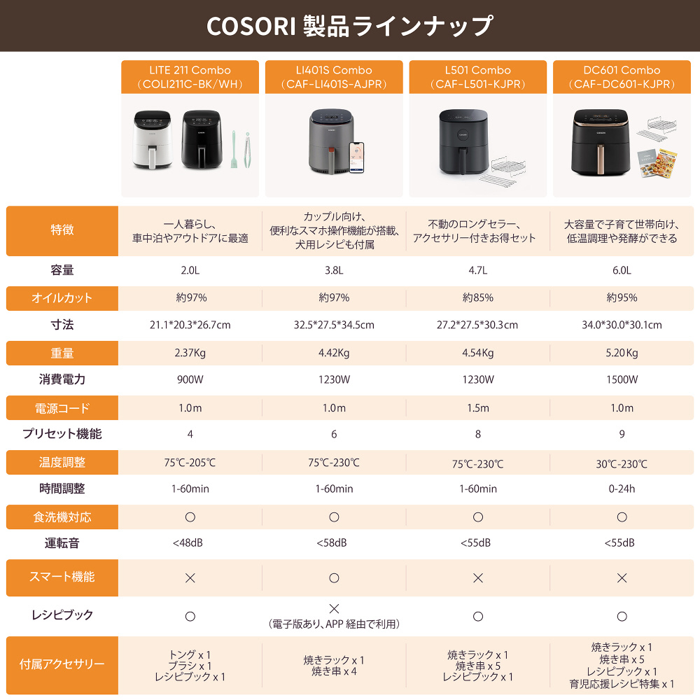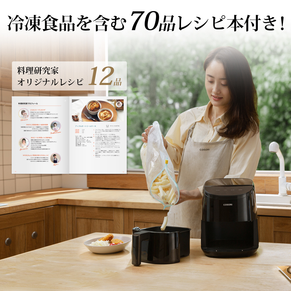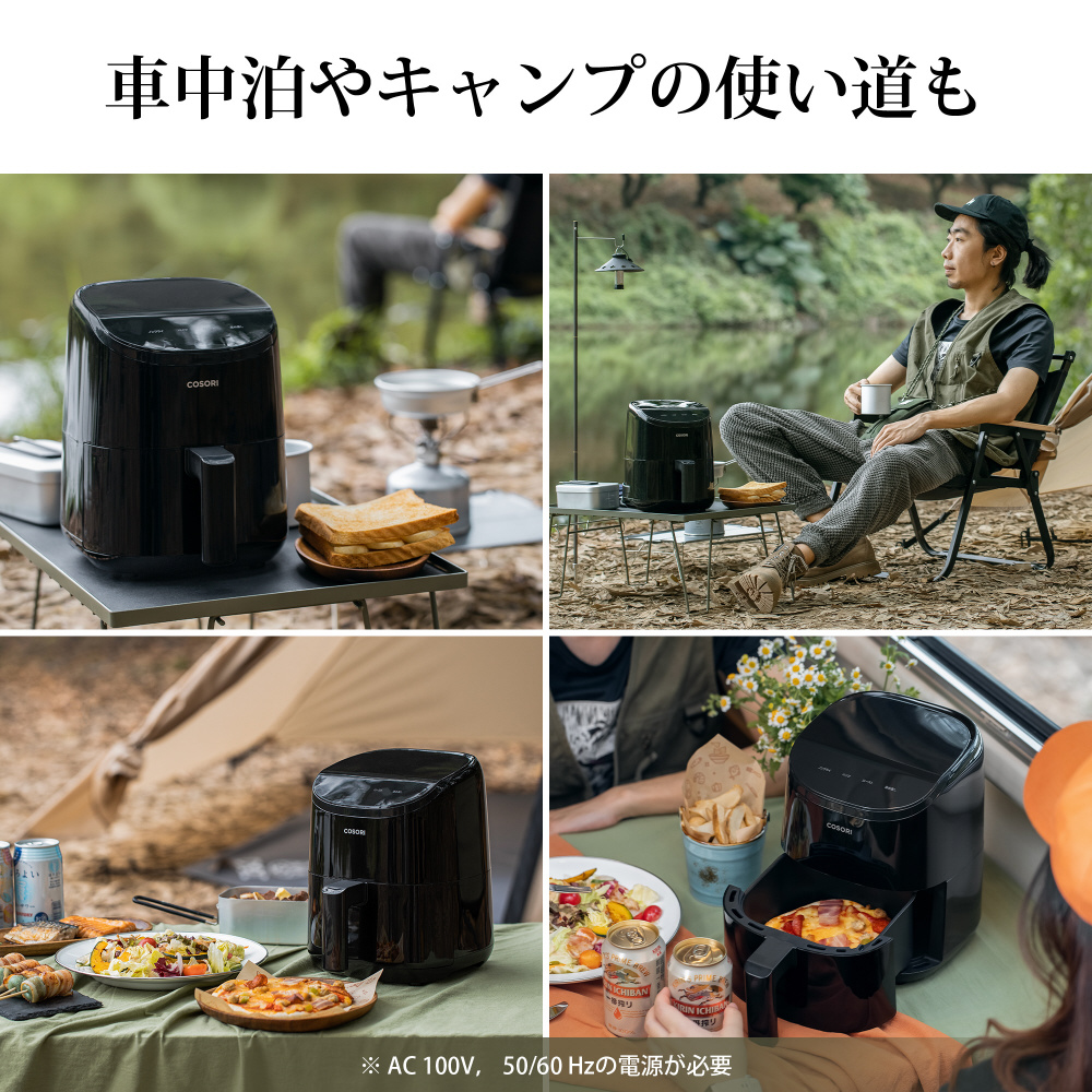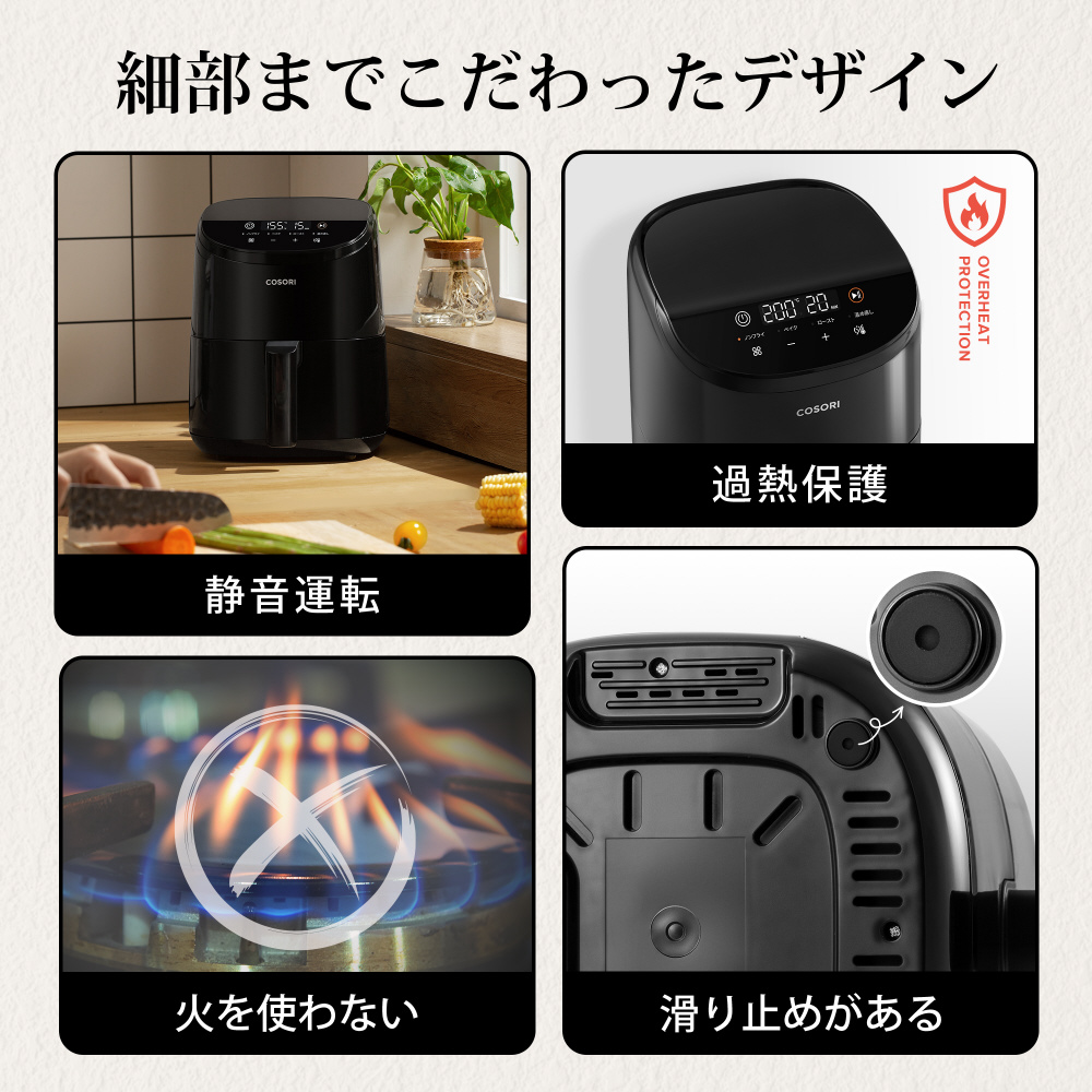 【コンパクト】1~2人にぴったりなCOSORI2Lノンフライヤーが遂に登場!一人暮らしはもちろん、車中泊やアウトドア活動にもぴったりです。高さと設置面両方ともA4サイズに収まるコンパクトサイズで、置き場所にも困りません。キッチンや棚に簡単に収納できます。