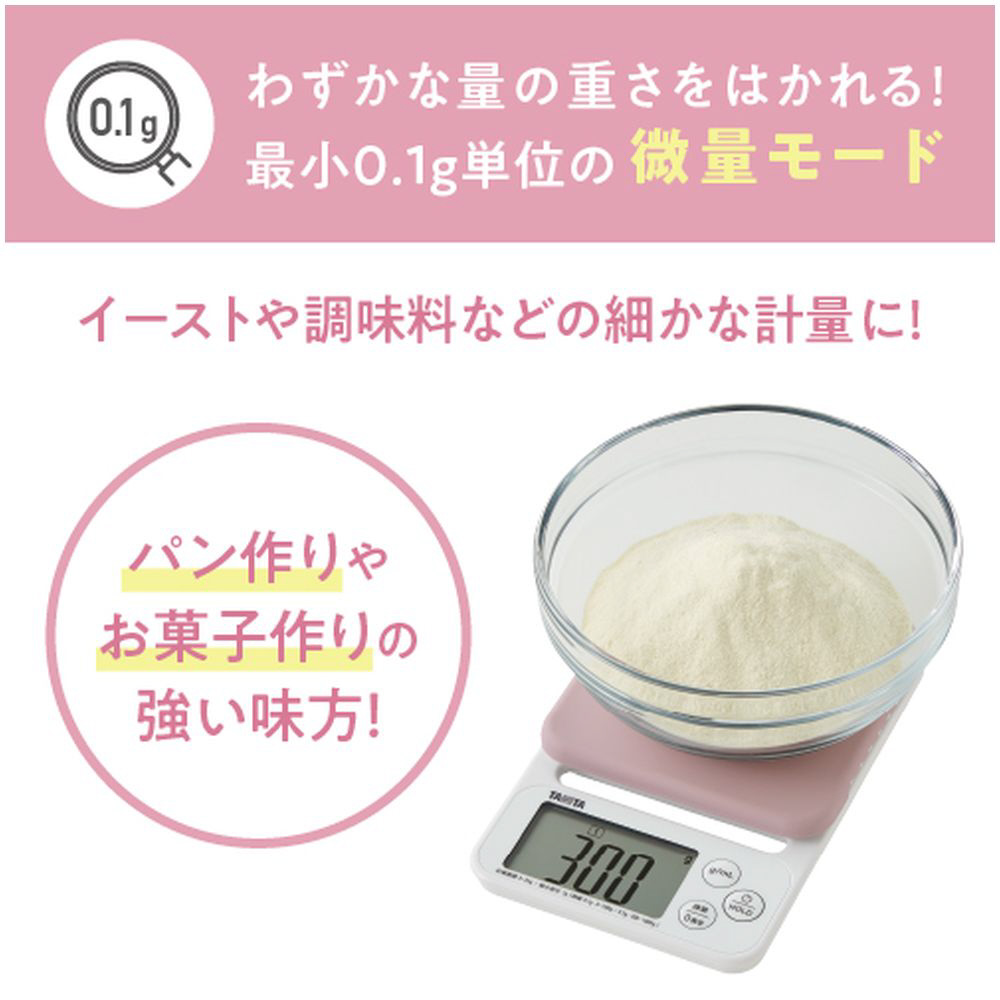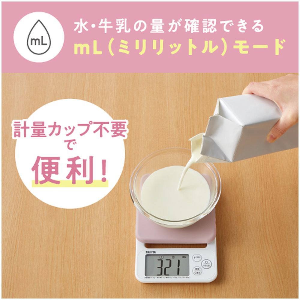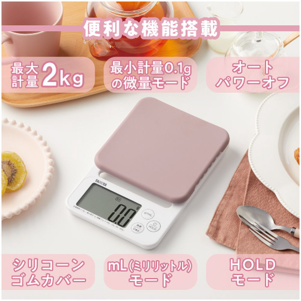 0.1g単位の精密計量、水や牛乳の容量測定、HOLDモード搭載、滑りにくいシリコーンゴムカバー付きのデジタルクッキングスケールです。