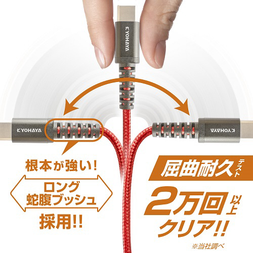 通常よりコネクタとケーブル接続部分のゴムカバーを長くすることで、コネクタにかかる負担を軽減します。 また、一番断線しやすい接続部分で2万回以上の屈曲耐久テストもクリアしている耐久性の高いケーブルです。(当社調べ)