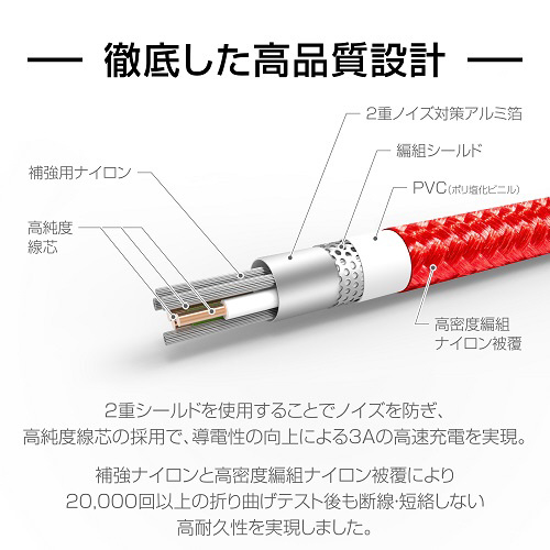 強靭タイプの高密度編み込み線を使用することにより、ケーブルの強さと柔らかさを両立し、断線に対して、従来の商品と比べても格段に強くなってます。