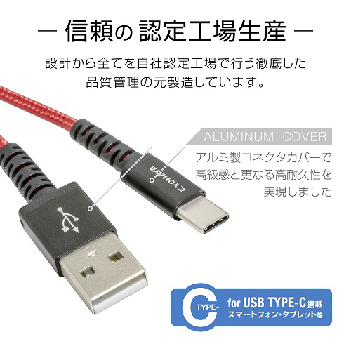 | 仕様1 | 対応機種:USB Type-C端子を搭載したスマートフォン・タブレット等の機器 規格:USB2.0規格準拠 対応:充電、通信 両対応 対応転送速度:最大480Mbps 対応電流:最大3A コネクタ:USB-USB Type-C ケーブル長:約1.2m(コネクタ含む) 重量:約30g 素材:コネクタ/アルミ ケーブル/表面ナイロン |