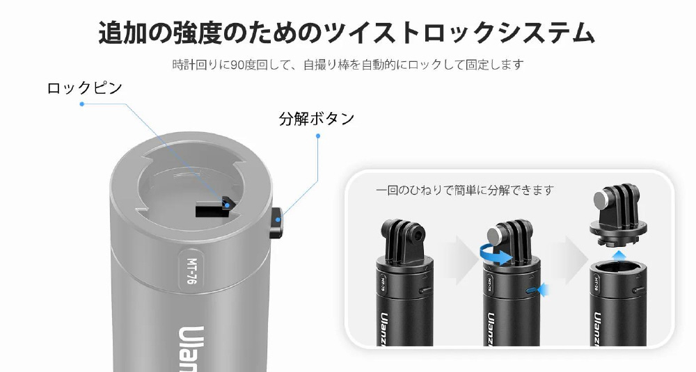 ・追加の強度のためのねじ回しロックシステム:時計回りに90°回転して、セルフィースティックを自動的にロックして固定します。