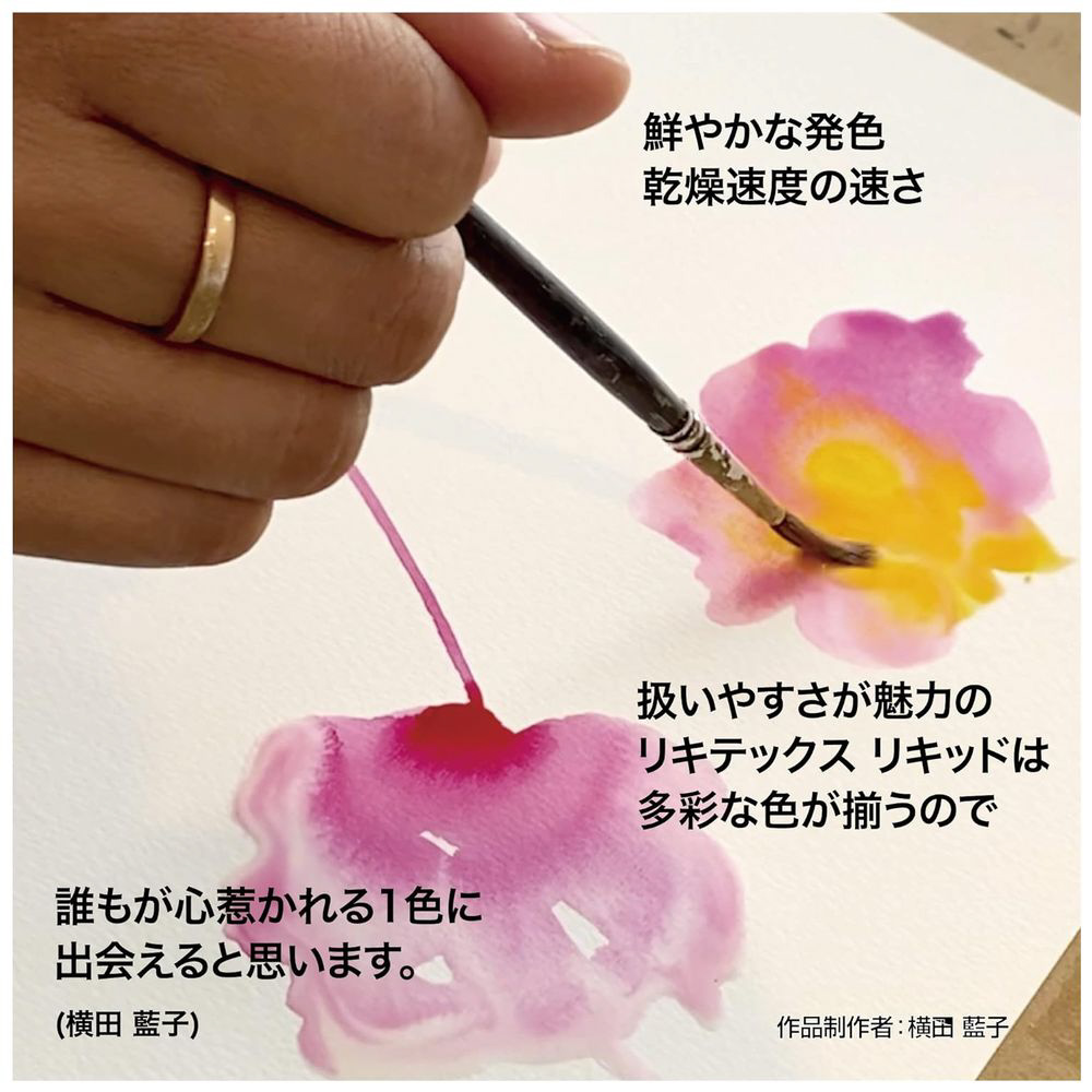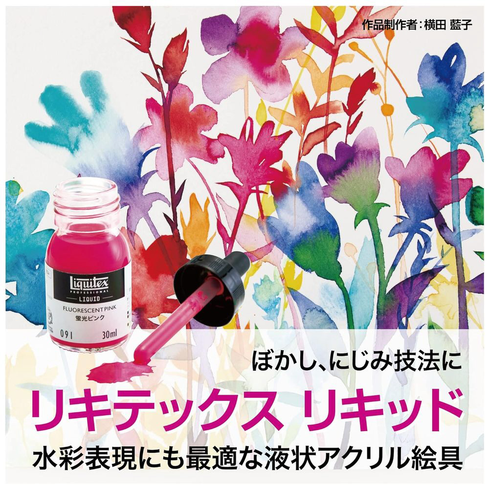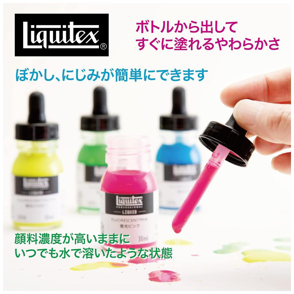 アーティストクオリティの耐光性顔料を使用した、さらっとした液状のアクリル絵具。染料ではなく顔料を使用しているため、褪色に強く、混じり気のない発色。すべてのアクリル絵具と同様に、素早く乾いて、濡れ色と乾いた後の色の差が少なく、耐水性のため再び濡らしたり、重ね塗りしたりしてもにじんだり、下の色が溶け出すことはありません。さまざまな透明度の混じり気のないリキッドカラーが揃っています。
