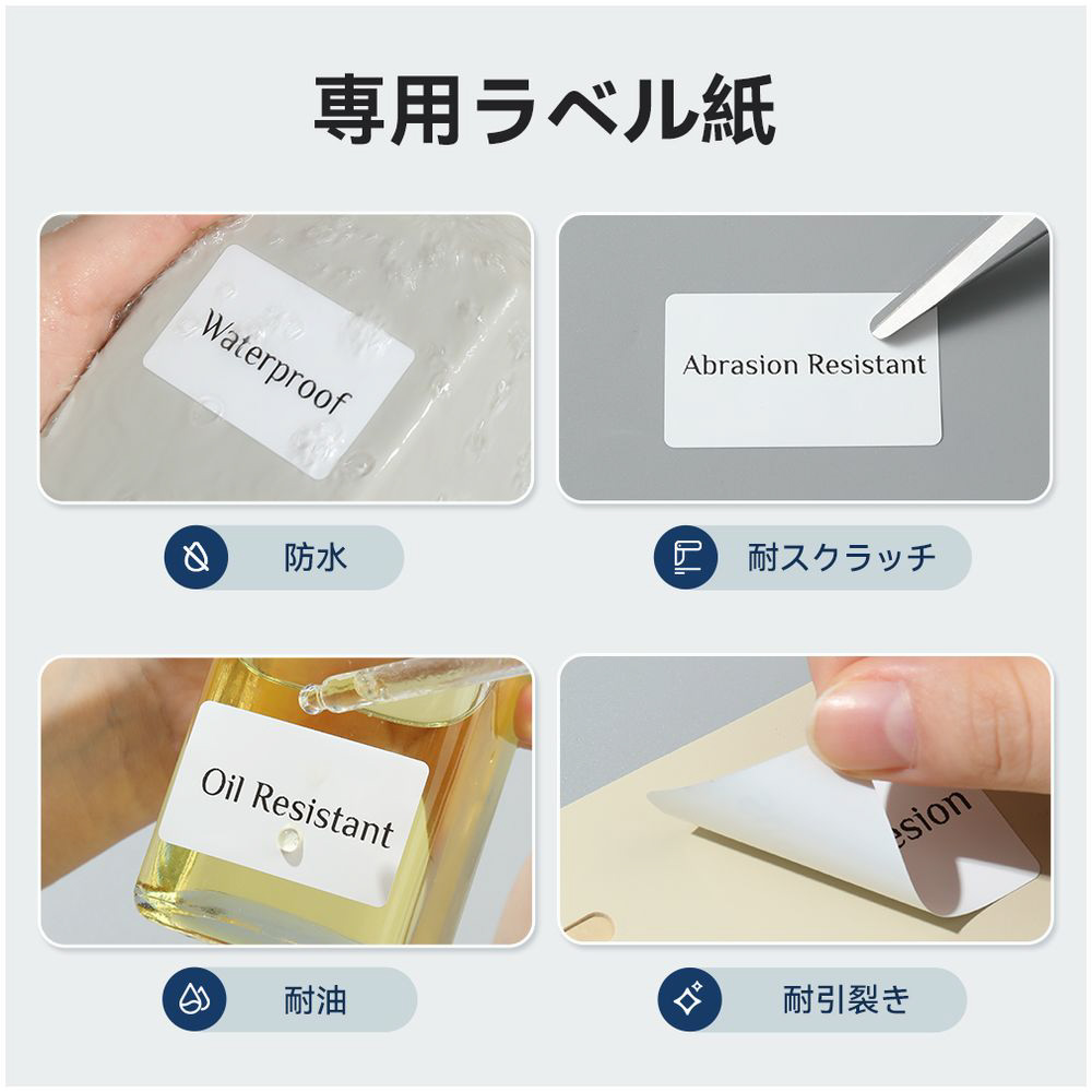 水に強い嬉しい防水加工、破れにくい耐スクラッチで油脂や汚れにも強いのではがれにくく、どんなシチュエーションにも最適なラベルが作れます。