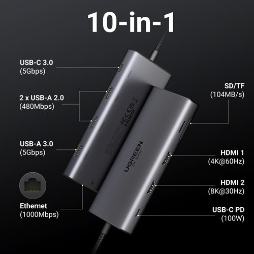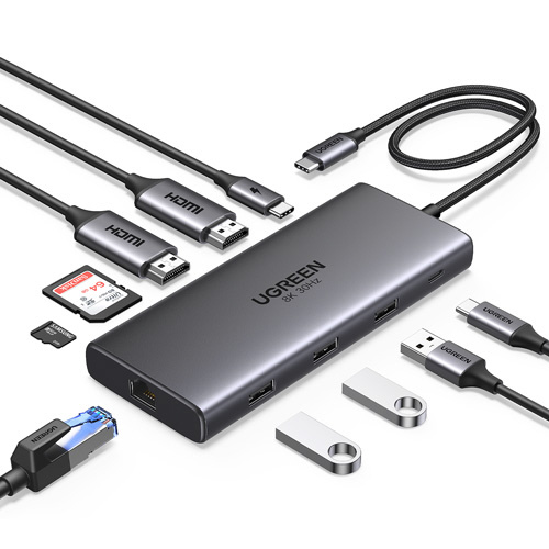 2つのHDMIポート、5Gbps対応USB-Cポート、USB-A 3.0ポート、2つのUSB-A 2.0ポート、100W PD充電ポート、RJ45 Ethernet、SD/microSDカードリーダーを備え、パソコンのUSB-Cポートの可能性をさらに広げます。