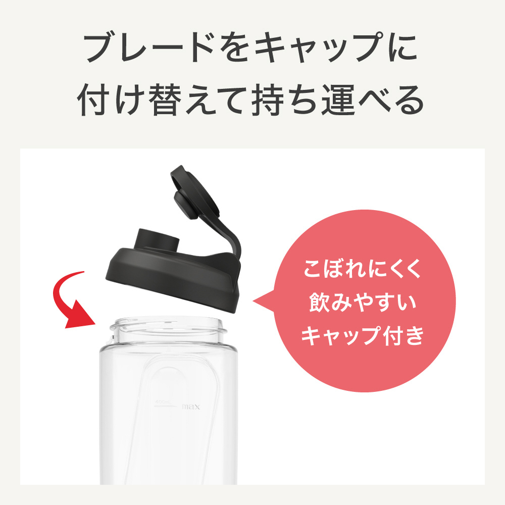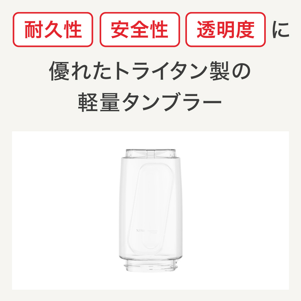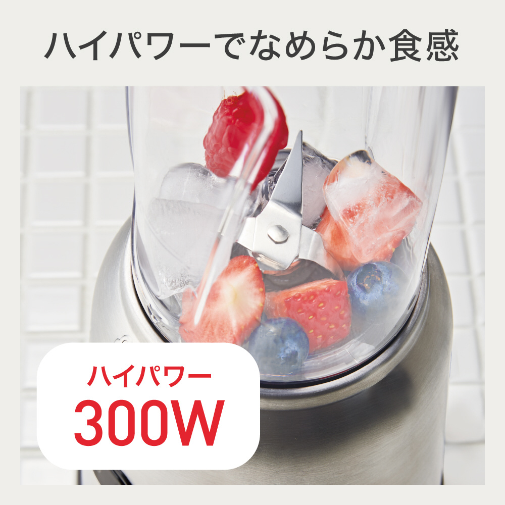 300W のハイパワーと 4 枚刃のステンレスブレードで硬い食材や氷も素早く砕き、なめらかなスムージーやスープがあっという間にできあがります(※)。また、本体にタンブラーが正しくセットされるまで作動しないスマートロック機能付きで、誤作動の心配もありません。